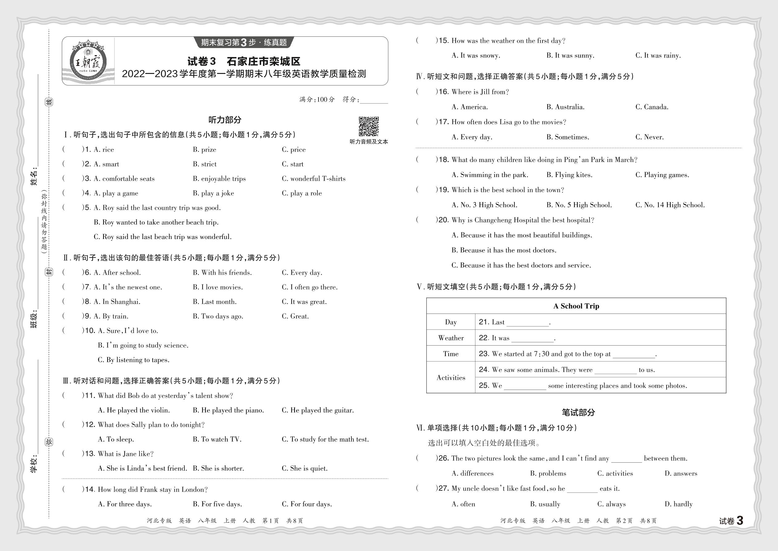 河北省石家庄市栾城区2022—2023学年度第一学期期末八年级英语教学质量检测(人教版)【3】