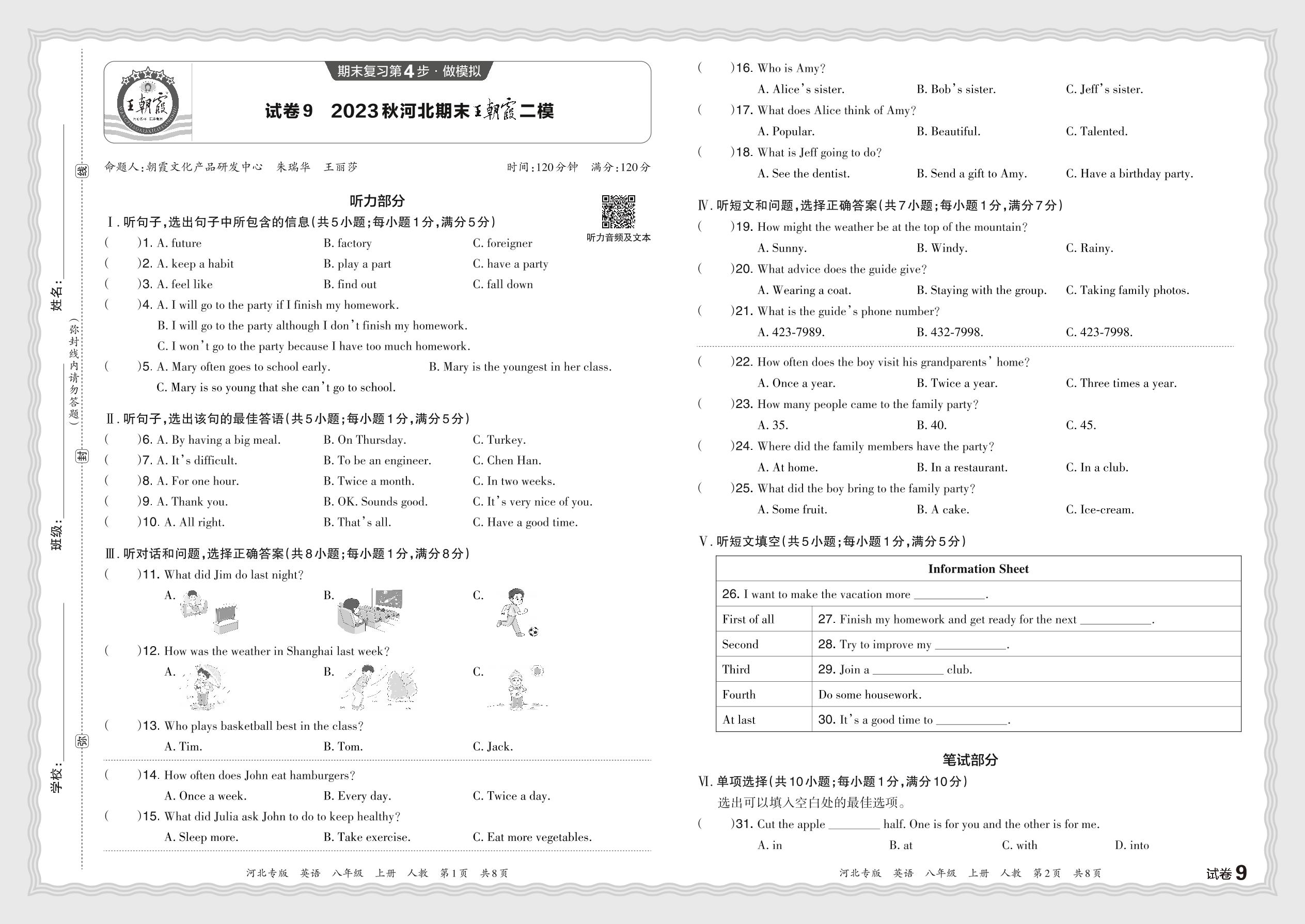 2023秋上册八年级英语人教版 河北期末王朝霞二模