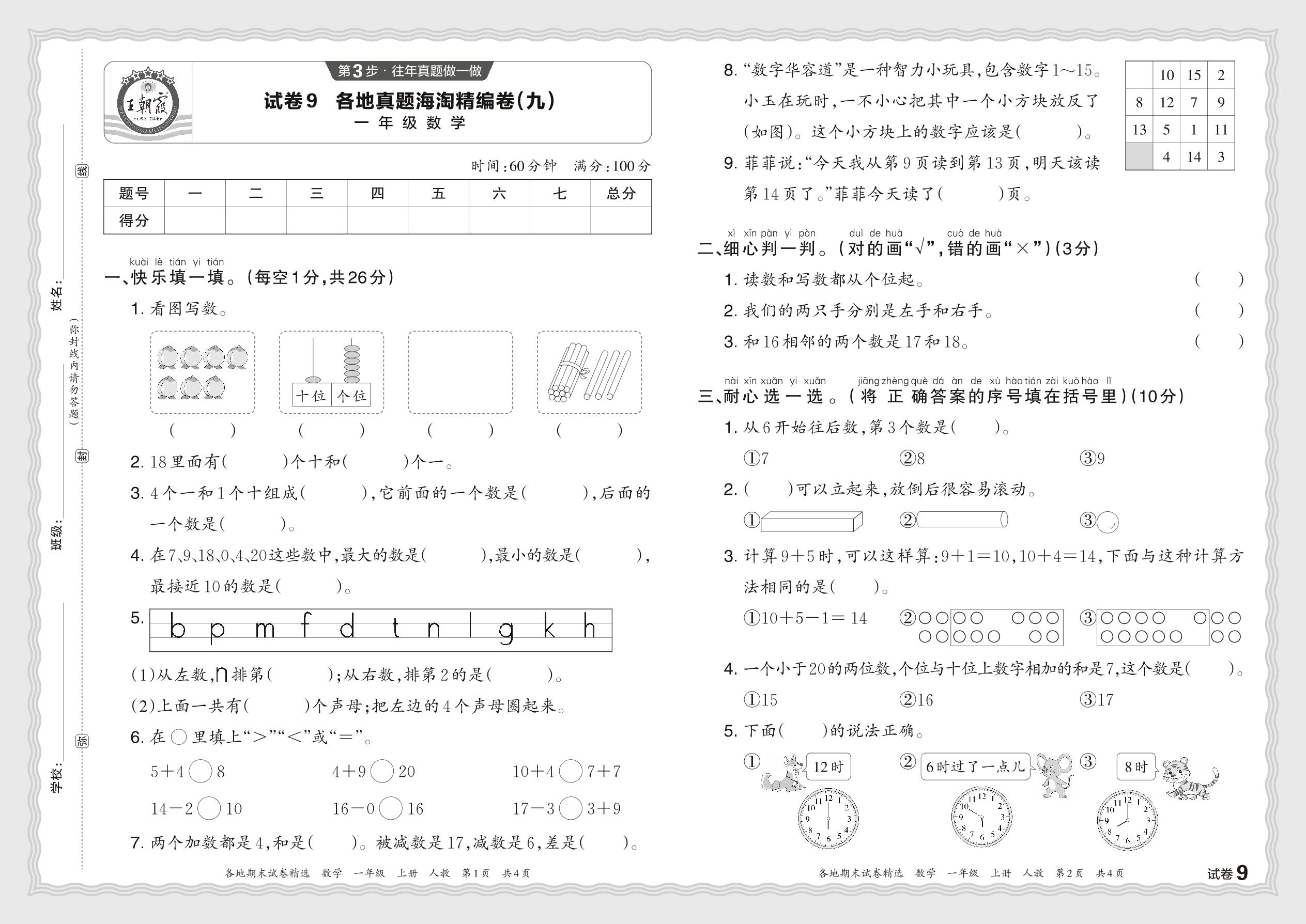 2023秋上册一年级数学人教版 各地真题海淘精编卷(九)JX
