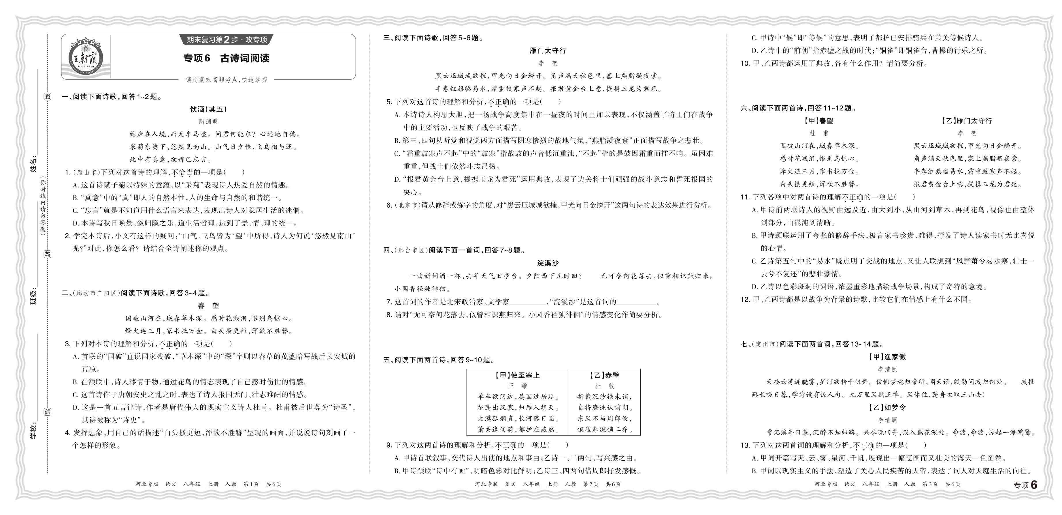 2023秋上册八年级语文人教版 期末专项卷·古诗词阅读【6】