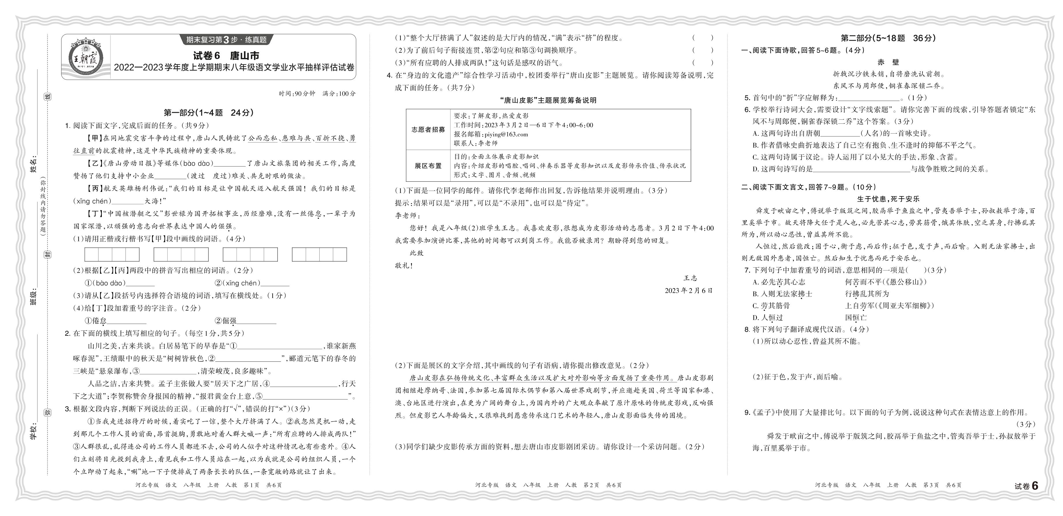 河北省唐山市2022—2023学年度上学期期末八年级语文学业水平抽样评估试卷(人教版)【6】