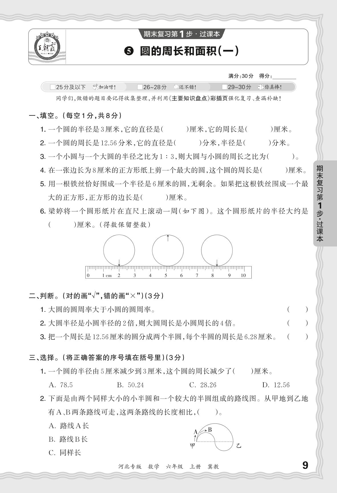 2023秋上册六年级数学冀教版 期末过课本·圆的周长和面积(一)【5】