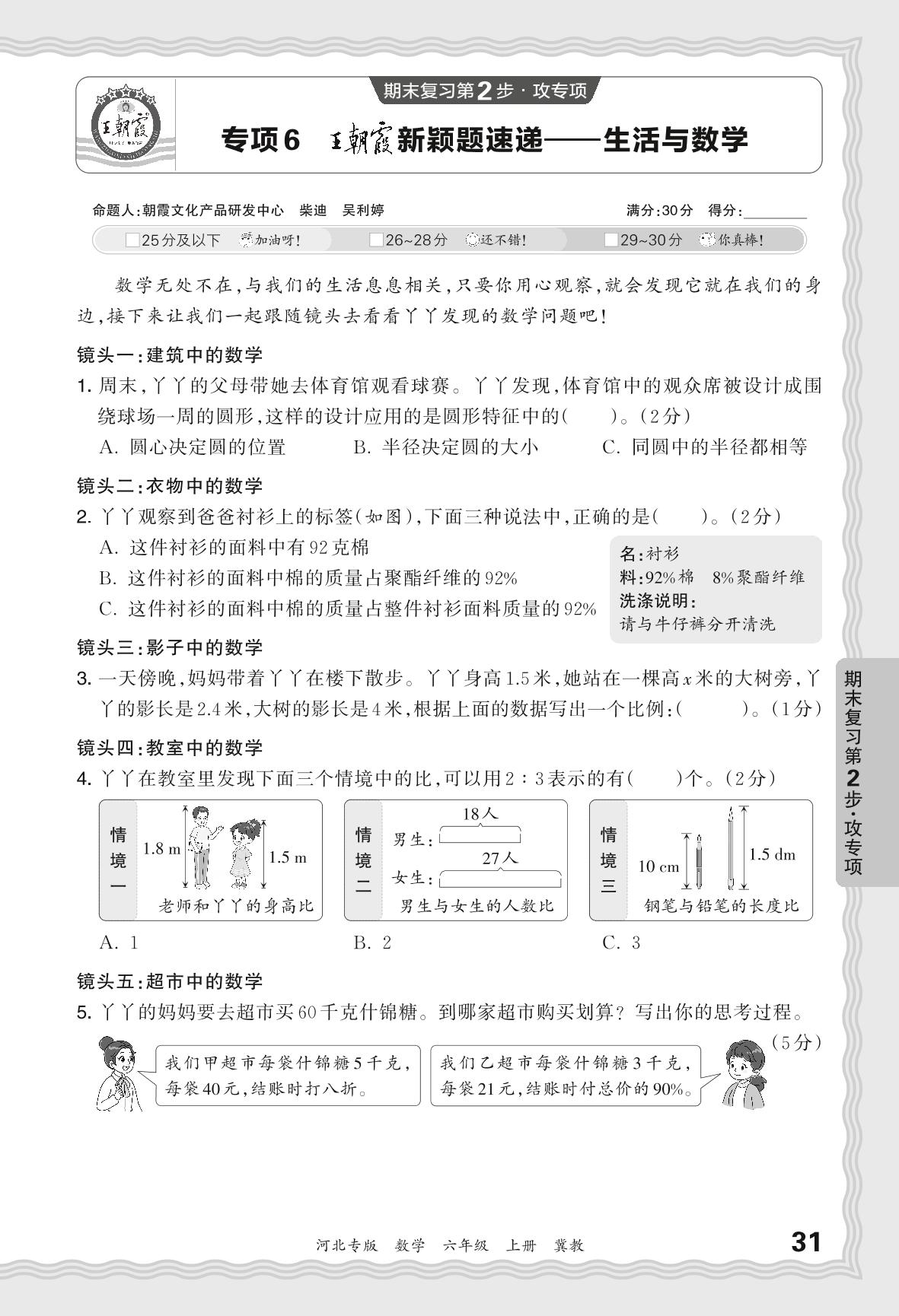 2023秋上册六年级数学冀教版 期末专项·王朝霞新颖题速递——生活与数学【6】