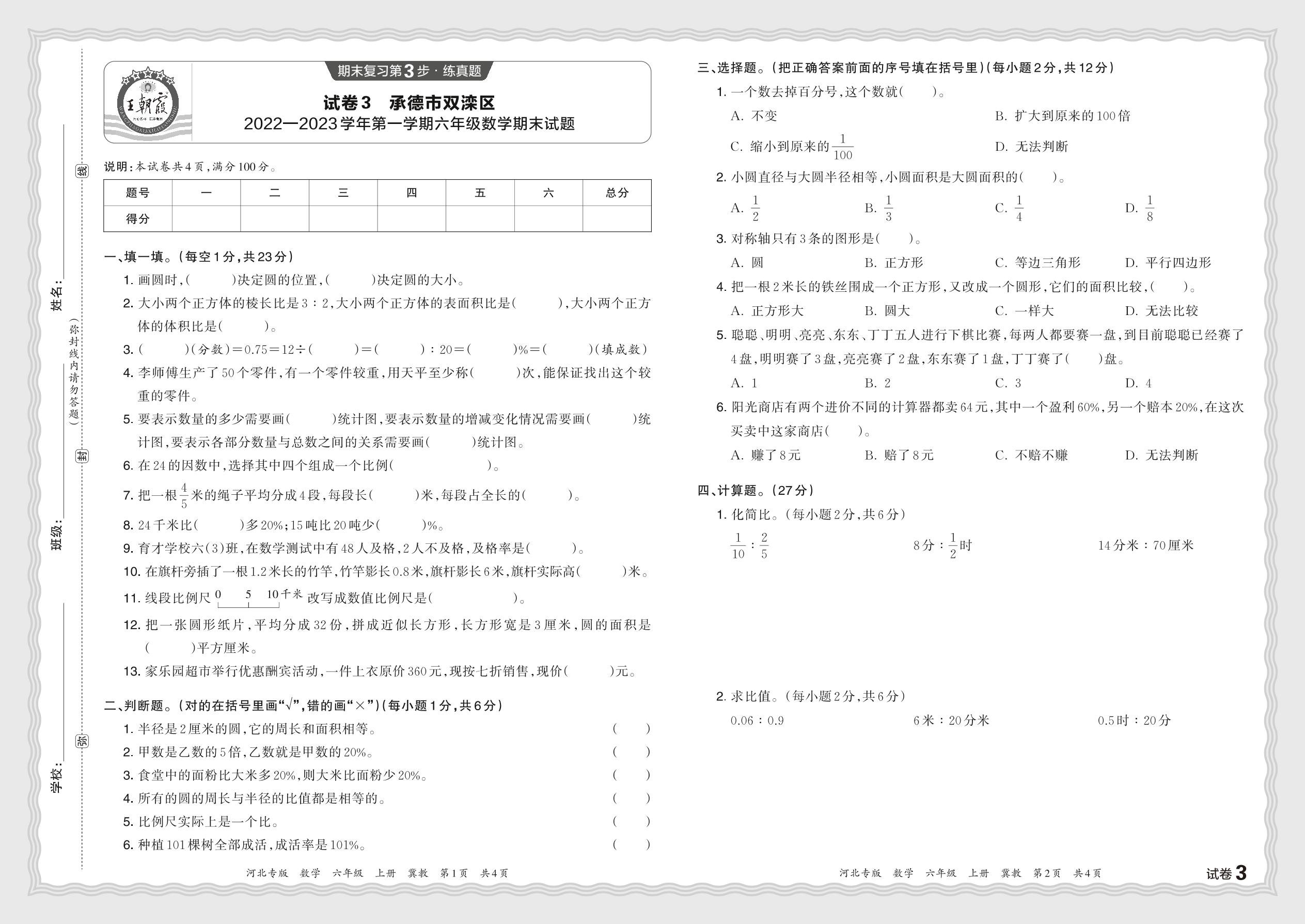 河北省承德市双滦区2022-2023学年第一学期六年级数学期末试题(冀教版)【3】