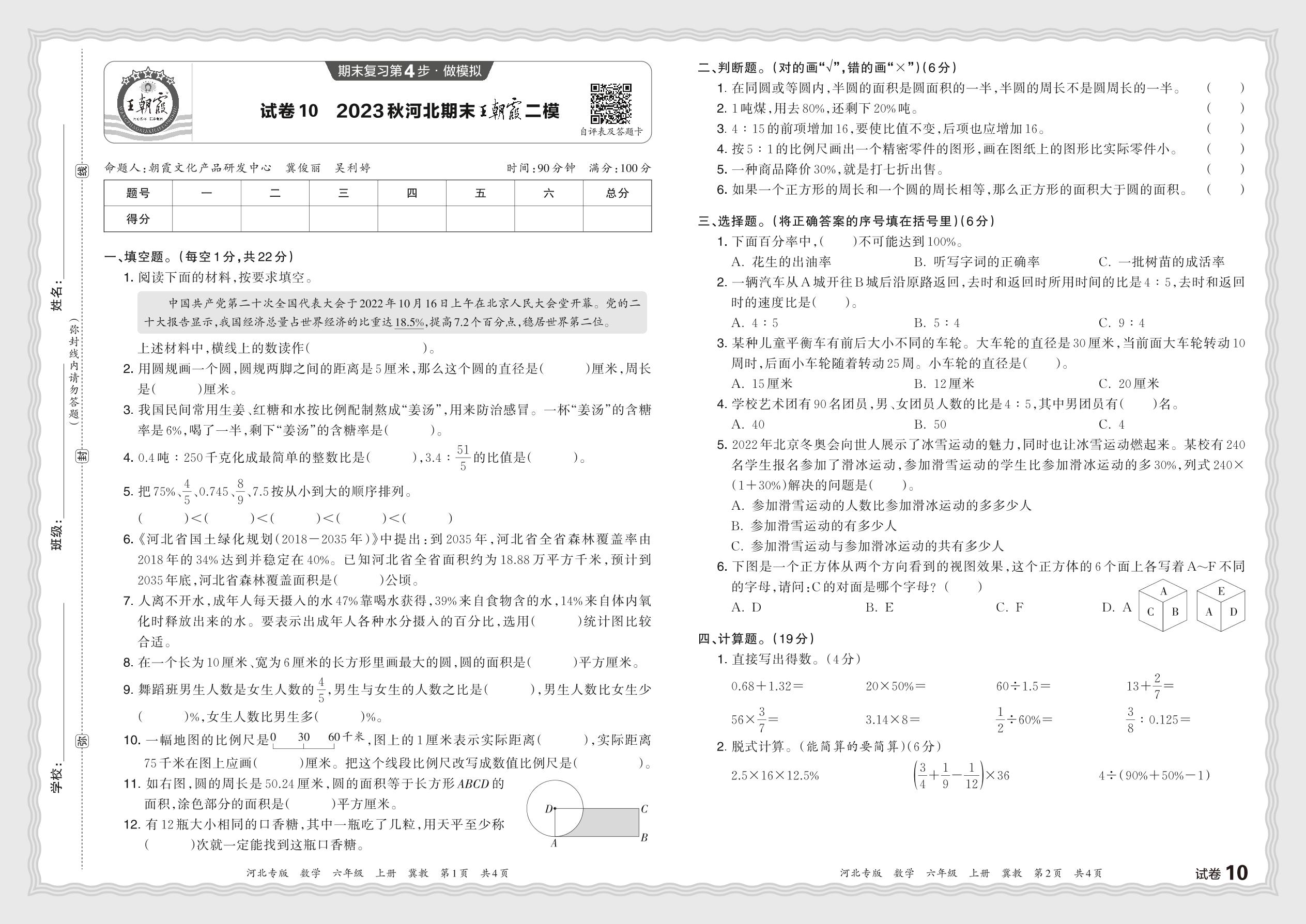 2023秋上册六年级数学冀教版 河北期末王朝霞二模