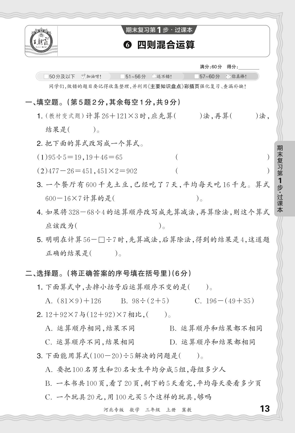 2023秋上册三年级数学冀教版 期末过课本·四则混合运算【6】