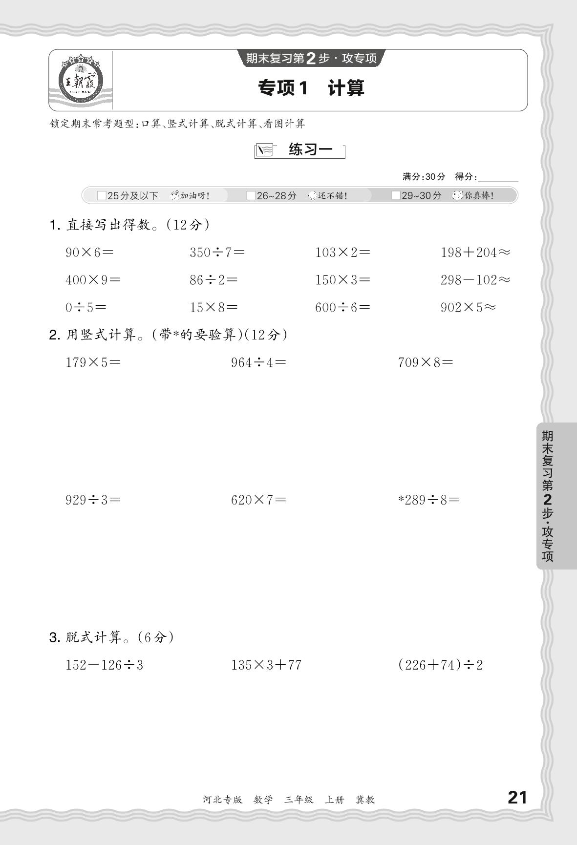 2023秋上册三年级数学冀教版 期末专项·计算【1】