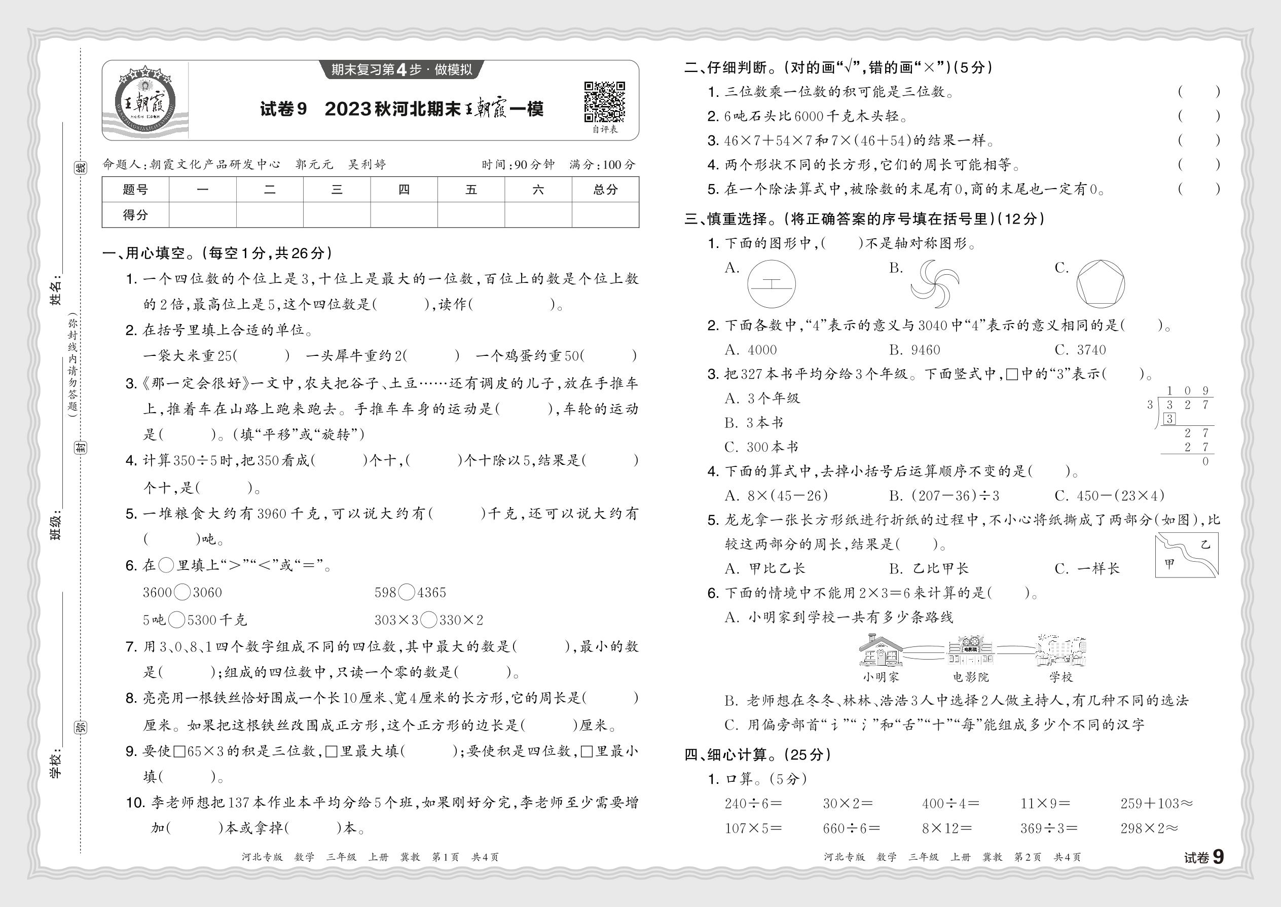 2023秋上册三年级数学冀教版 河北期末王朝霞一模