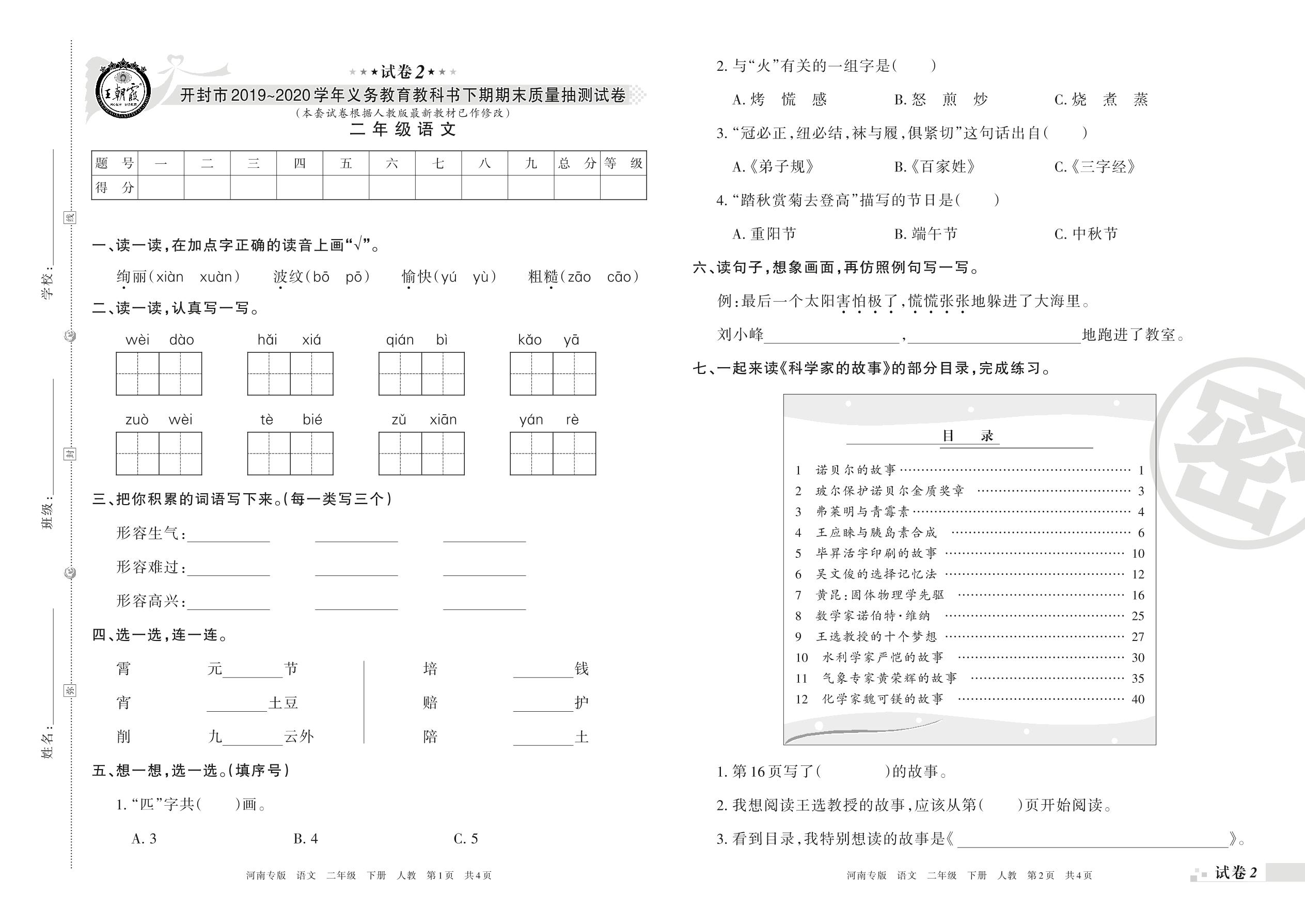 2019-2020学年第二学期开封市二年级语文试卷(人教版)【2】