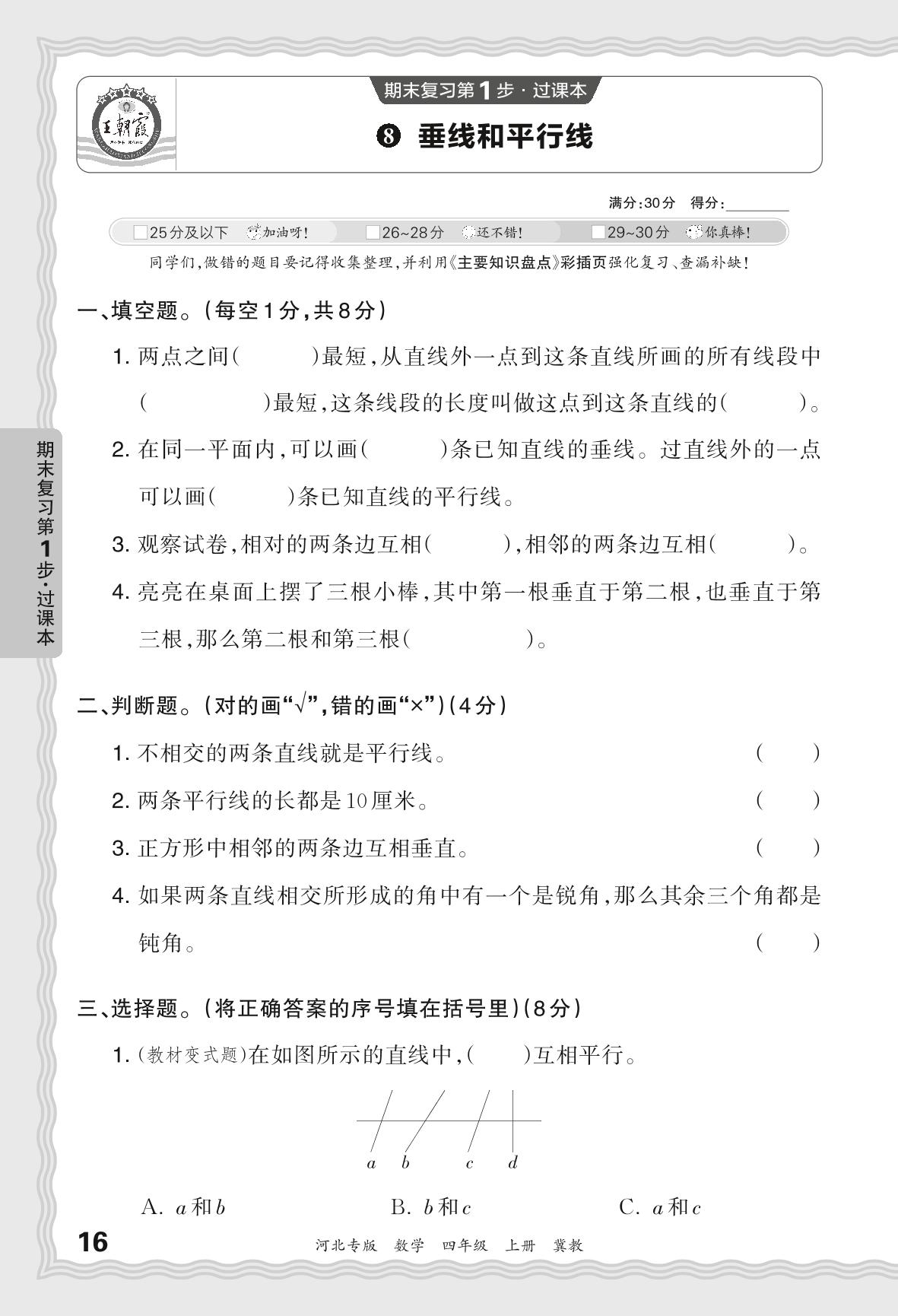 2023秋上册四年级数学冀教版 期末过课本·垂线和平行线【8】