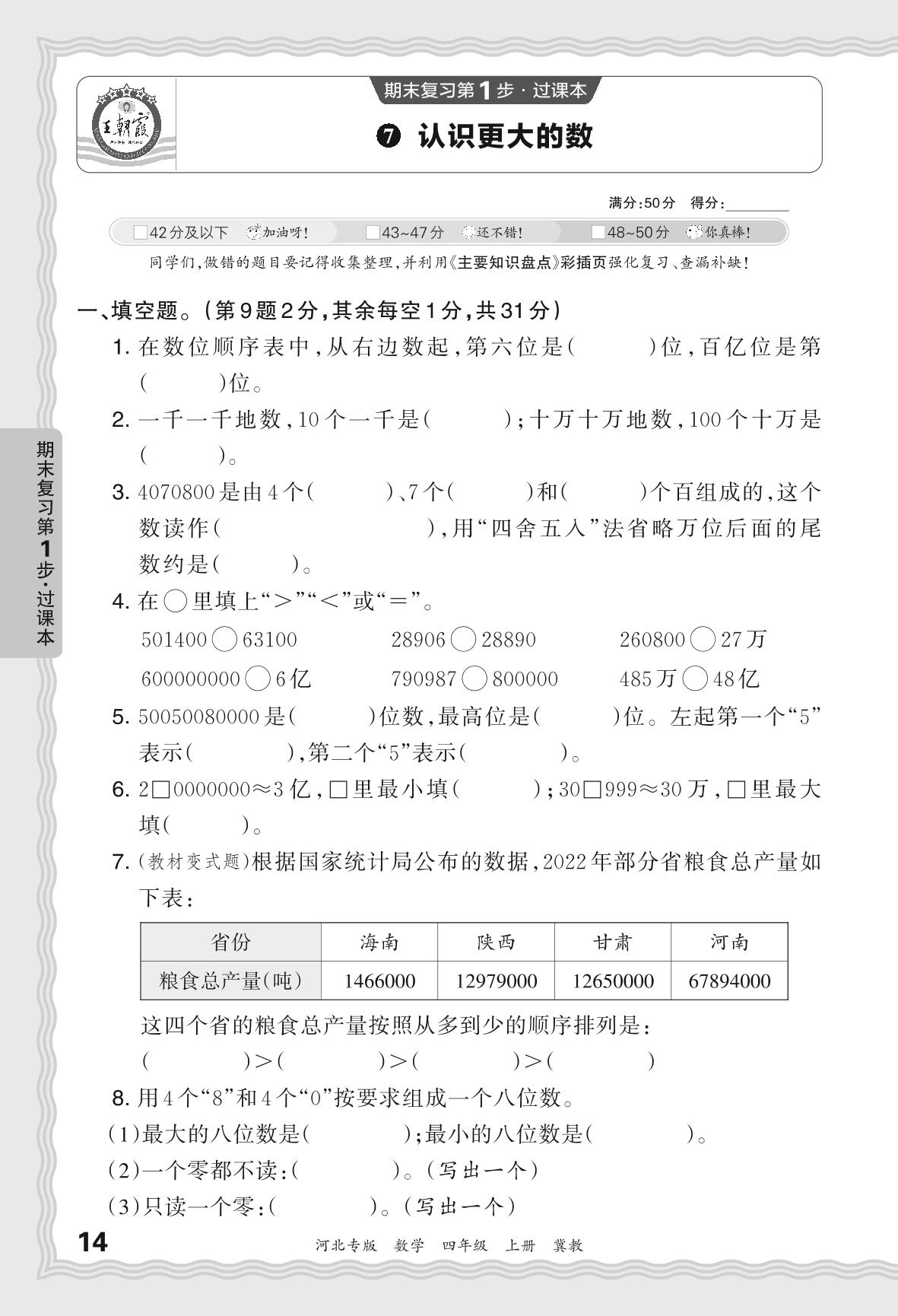 2023秋上册四年级数学冀教版 期末过课本·认识更大的数【7】