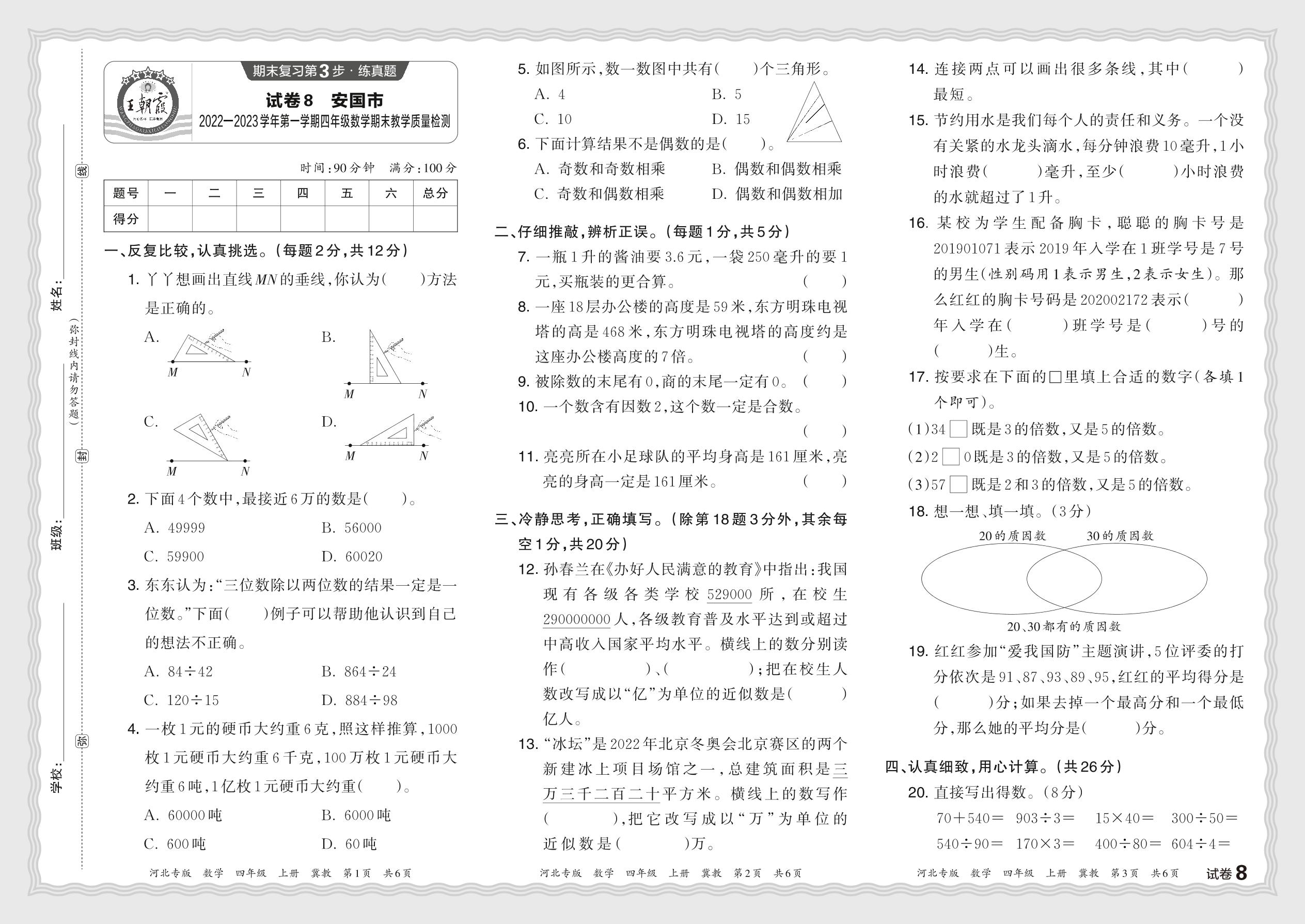 四年级数学冀教版上册期末卷