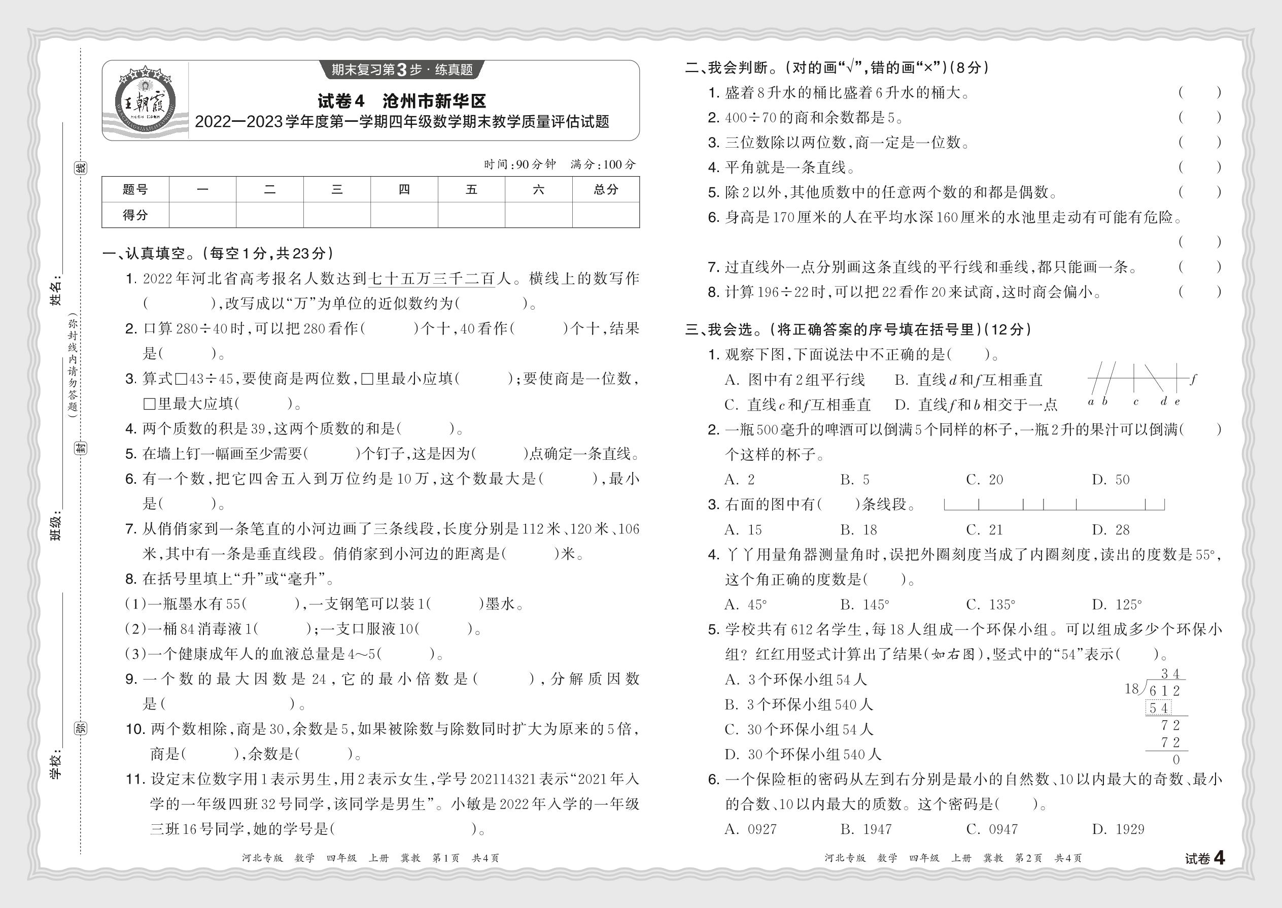 河北省沧州市新华区2022—2023学年度第一学期四年级数学期末教学质量评估试题(冀教版)【4】