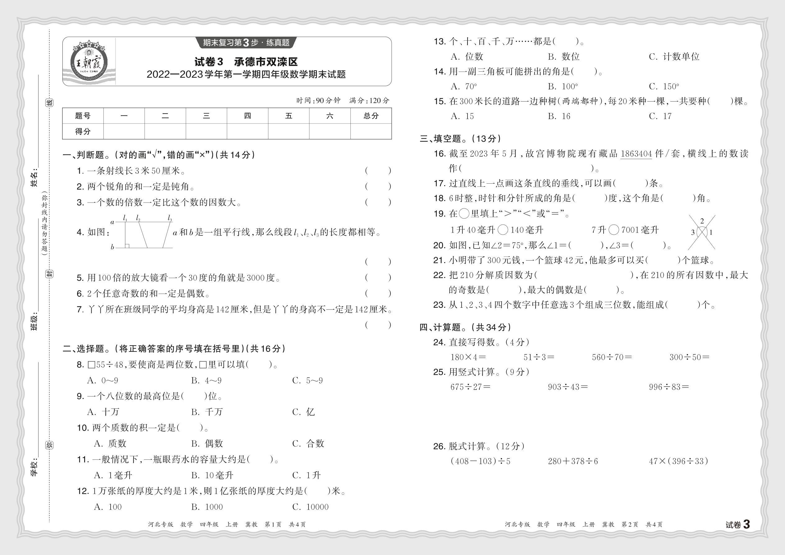 河北省承德市双滦区2022-2023学年第一学期四年级数学期末试题(冀教版)【3】