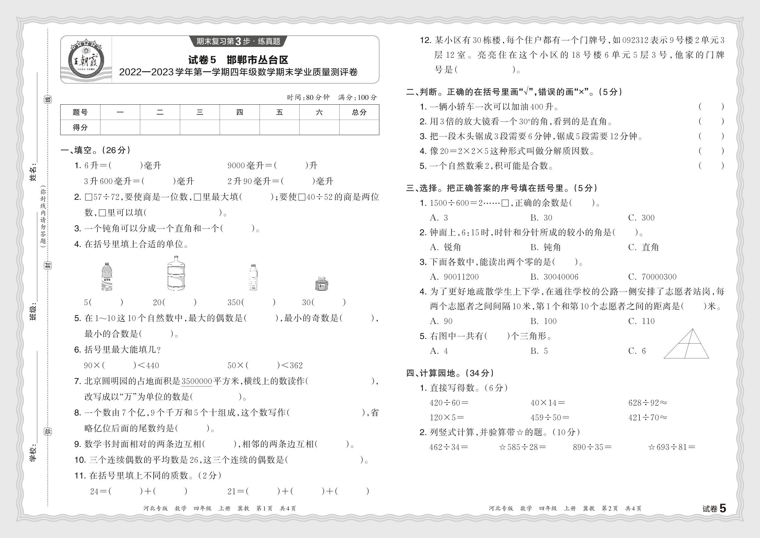 河北省邯郸市丛台区2022—2023学年第一学期四年级数学期末学业质量测评卷(冀教版)【5】