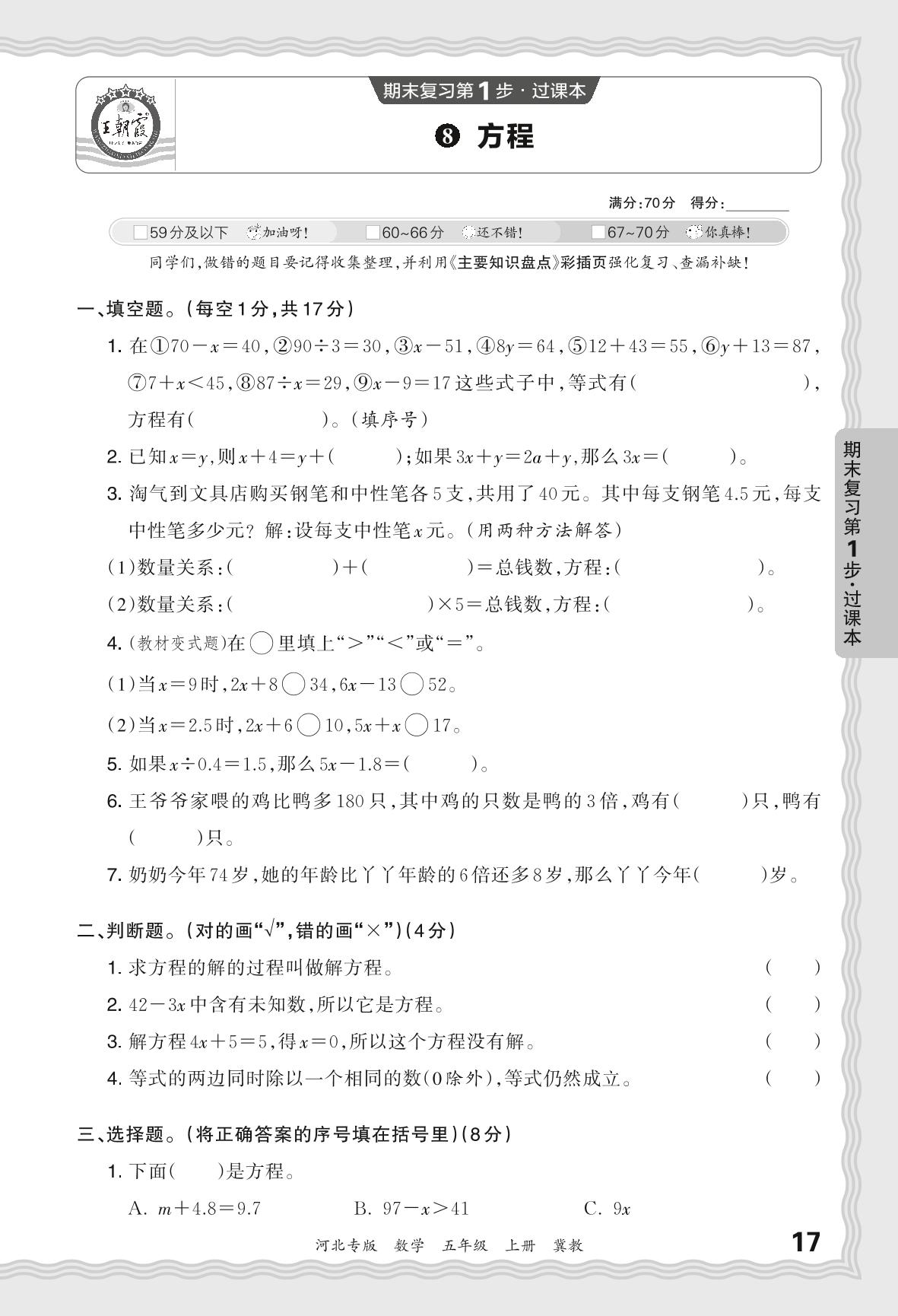2023秋上册五年级数学冀教版 期末过课本·方程【8】