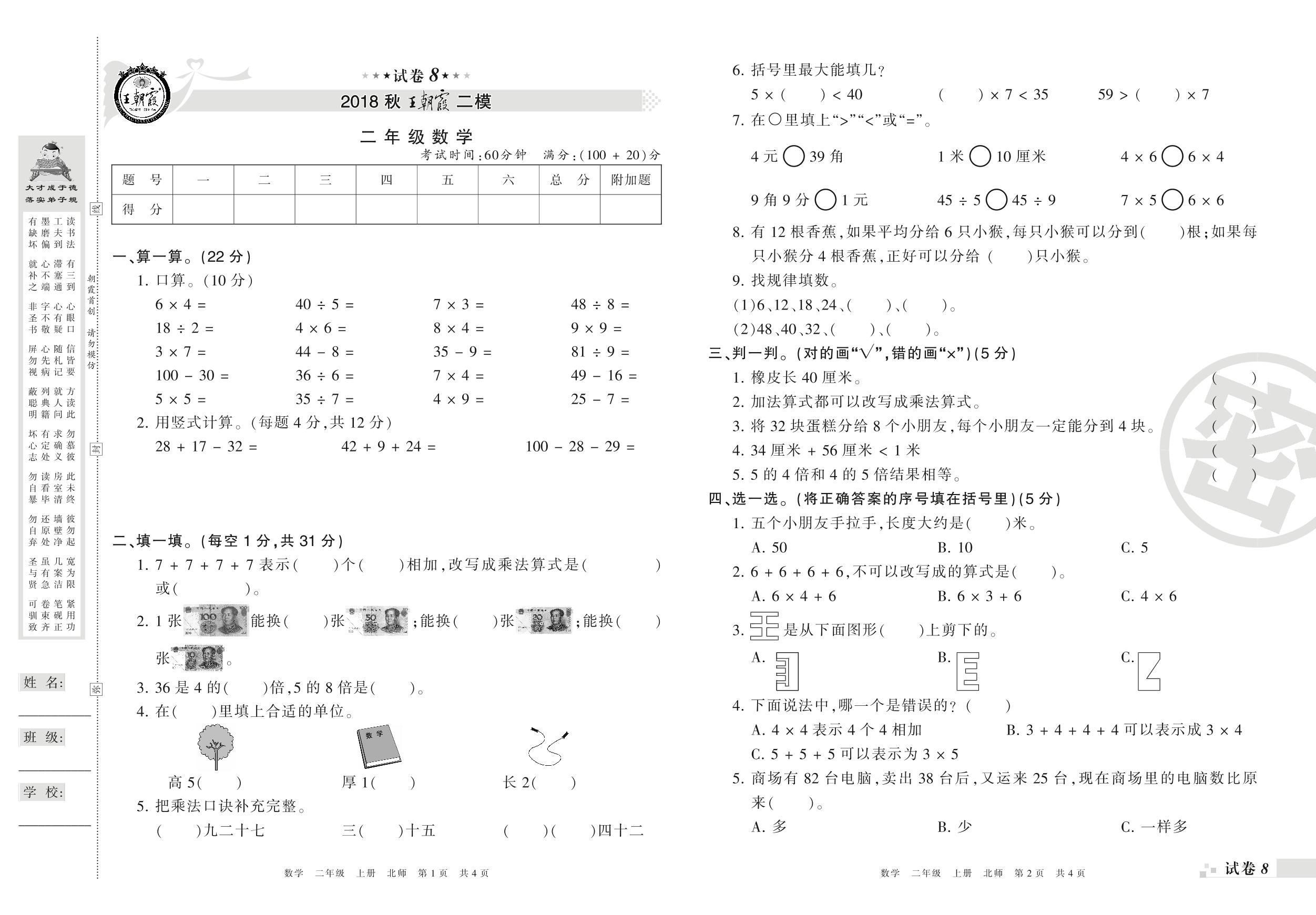 王朝霞期末模拟卷二年级上册数学(北师版)_R210803104348【8】
