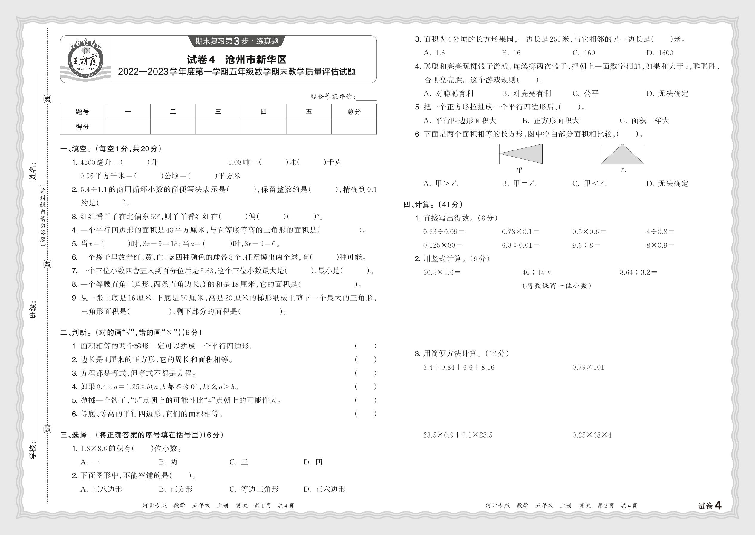 河北省沧州市新华区2022—2023学年度第一学期五年级数学期末教学质量评估试题(冀教版)【4】