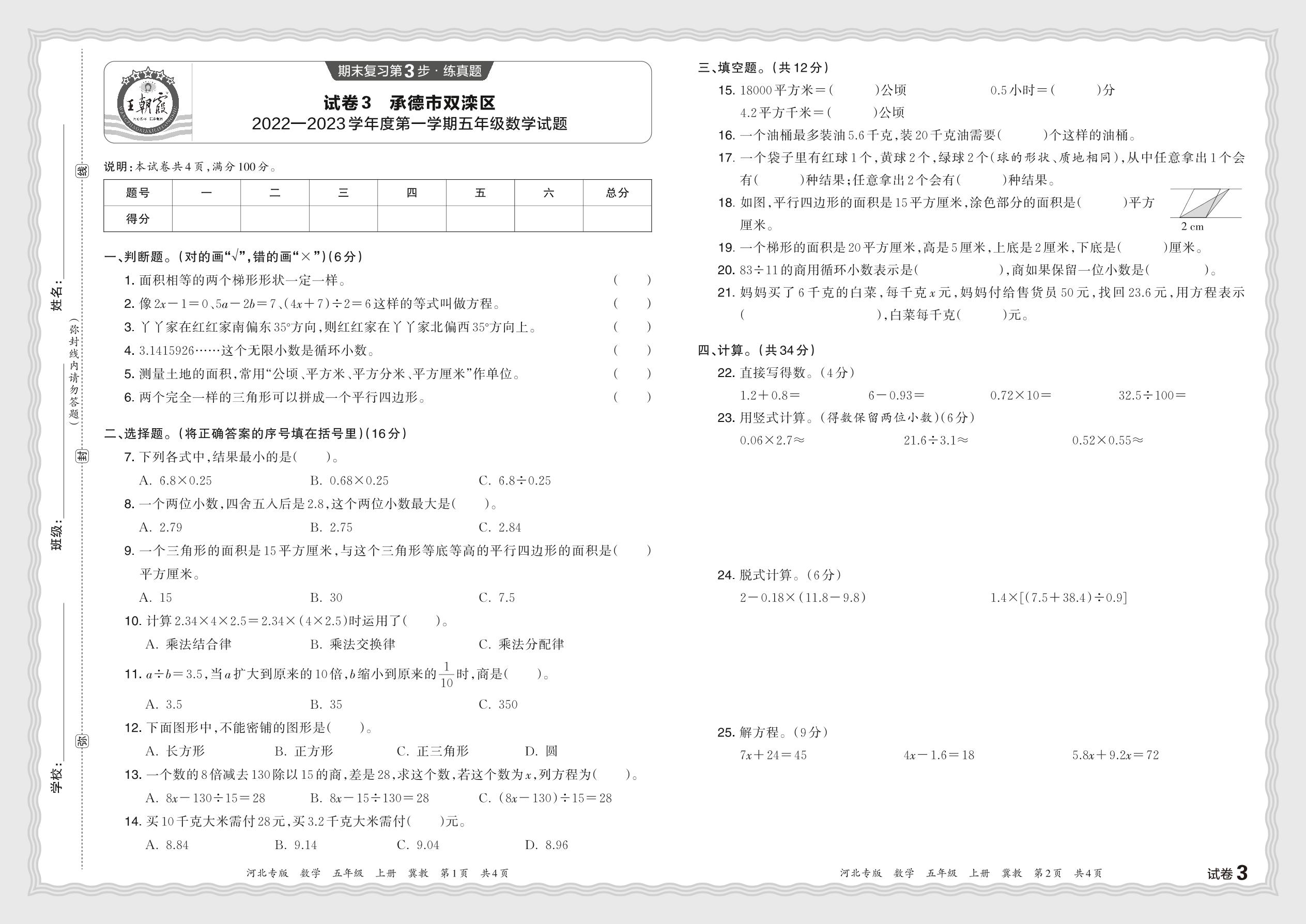 河北省承德市双滦区2022-2023学年第一学期五年级数学期末试题(冀教版)【3】