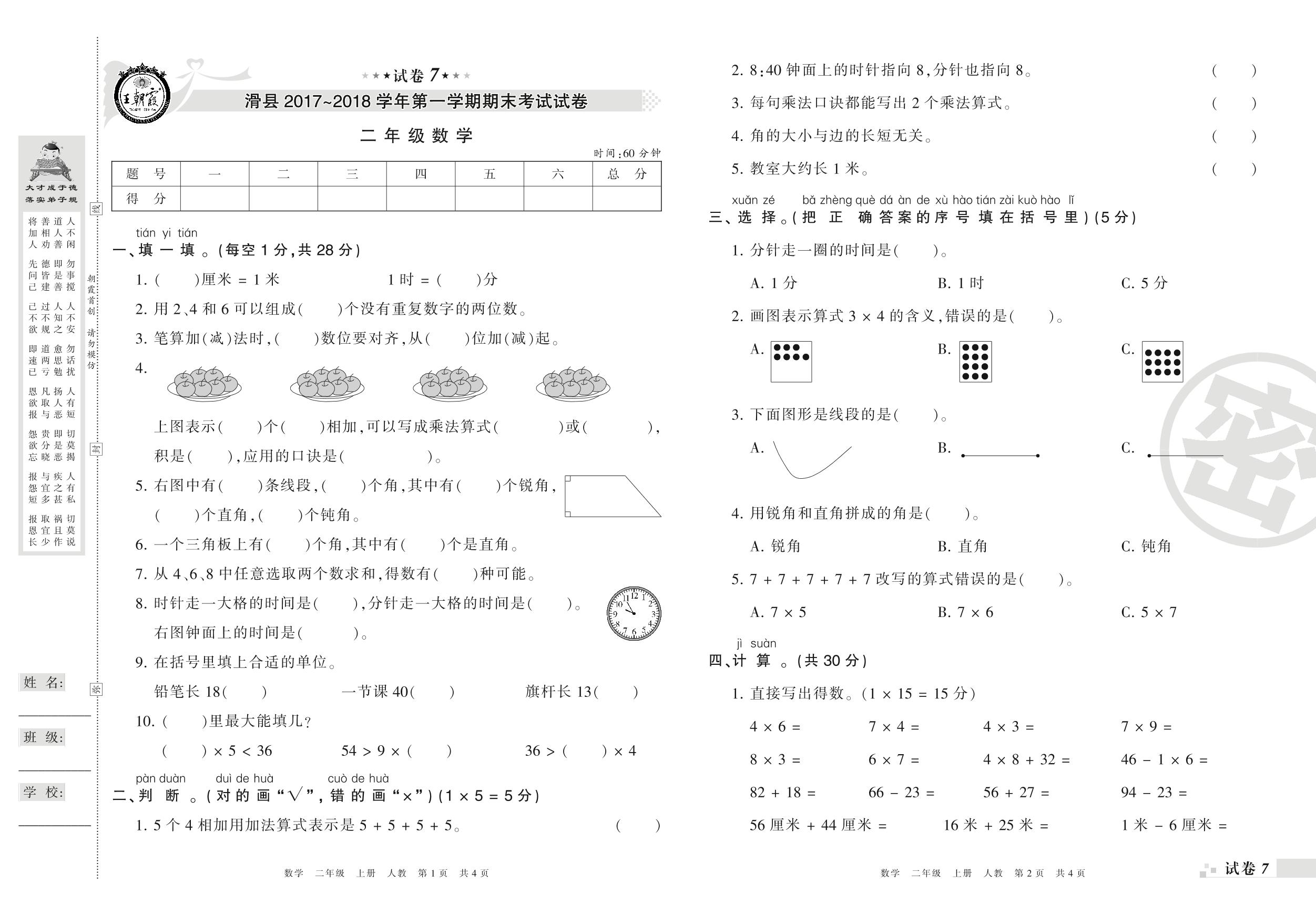 2017-2018学年第一学期安阳市滑县二年级数学试卷(人教版)【7】