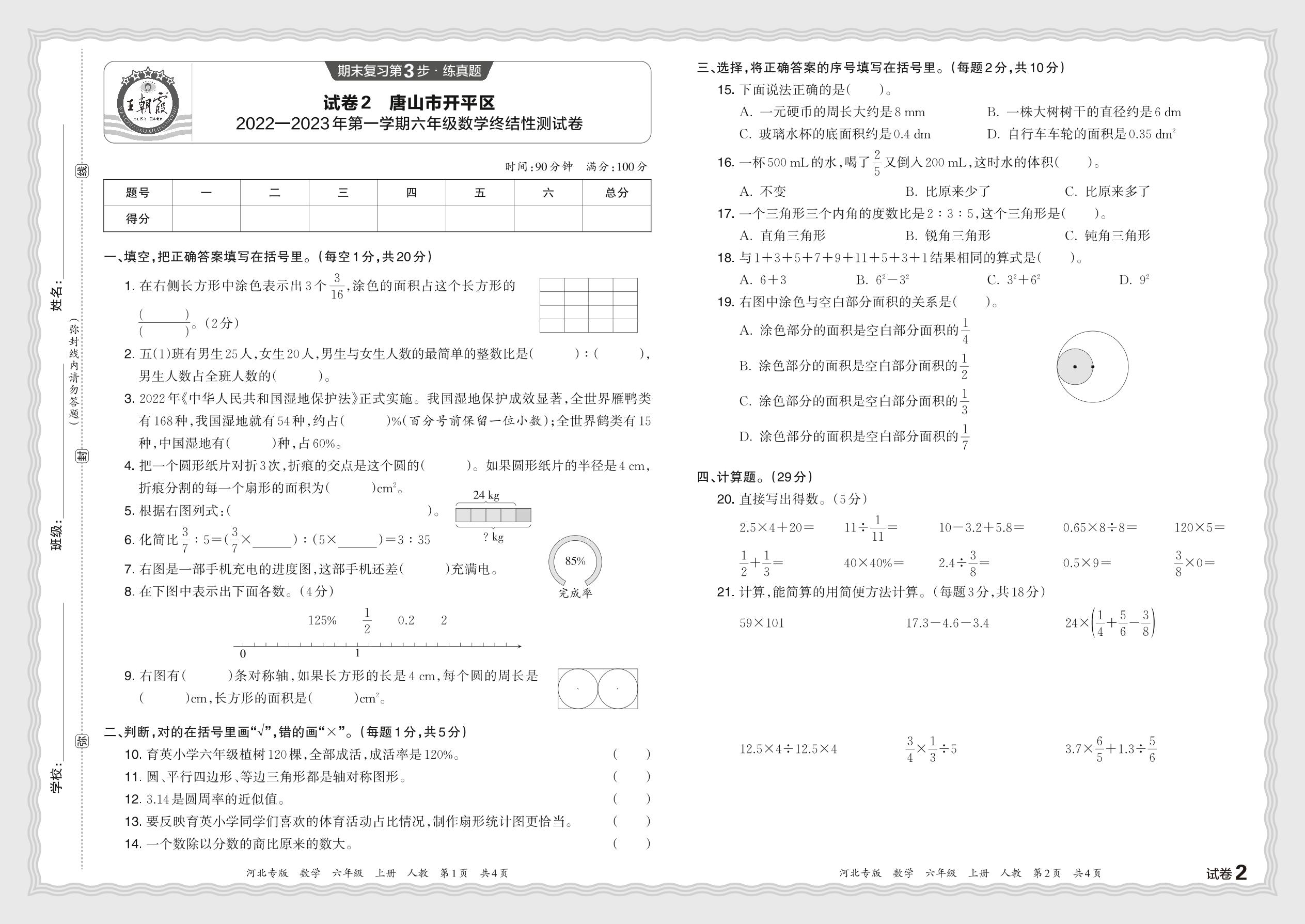河北省唐山市开平区2022—2023年第一学期六年级数学终结性测试卷(人教版)【2】