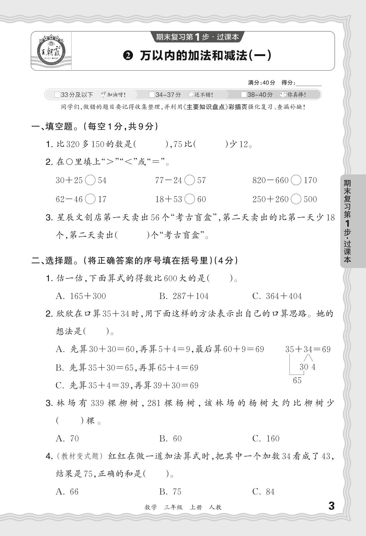 2023秋上册三年级数学人教版 期末过课本QMA版·万以内的加法和减法(一)【2】