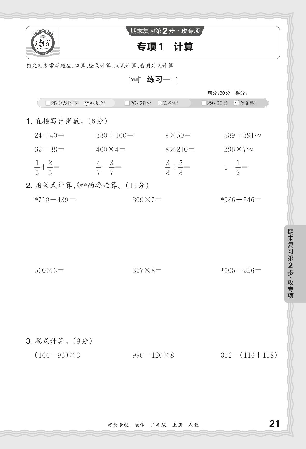 2023秋上册三年级数学人教版 期末专项·计算【1】