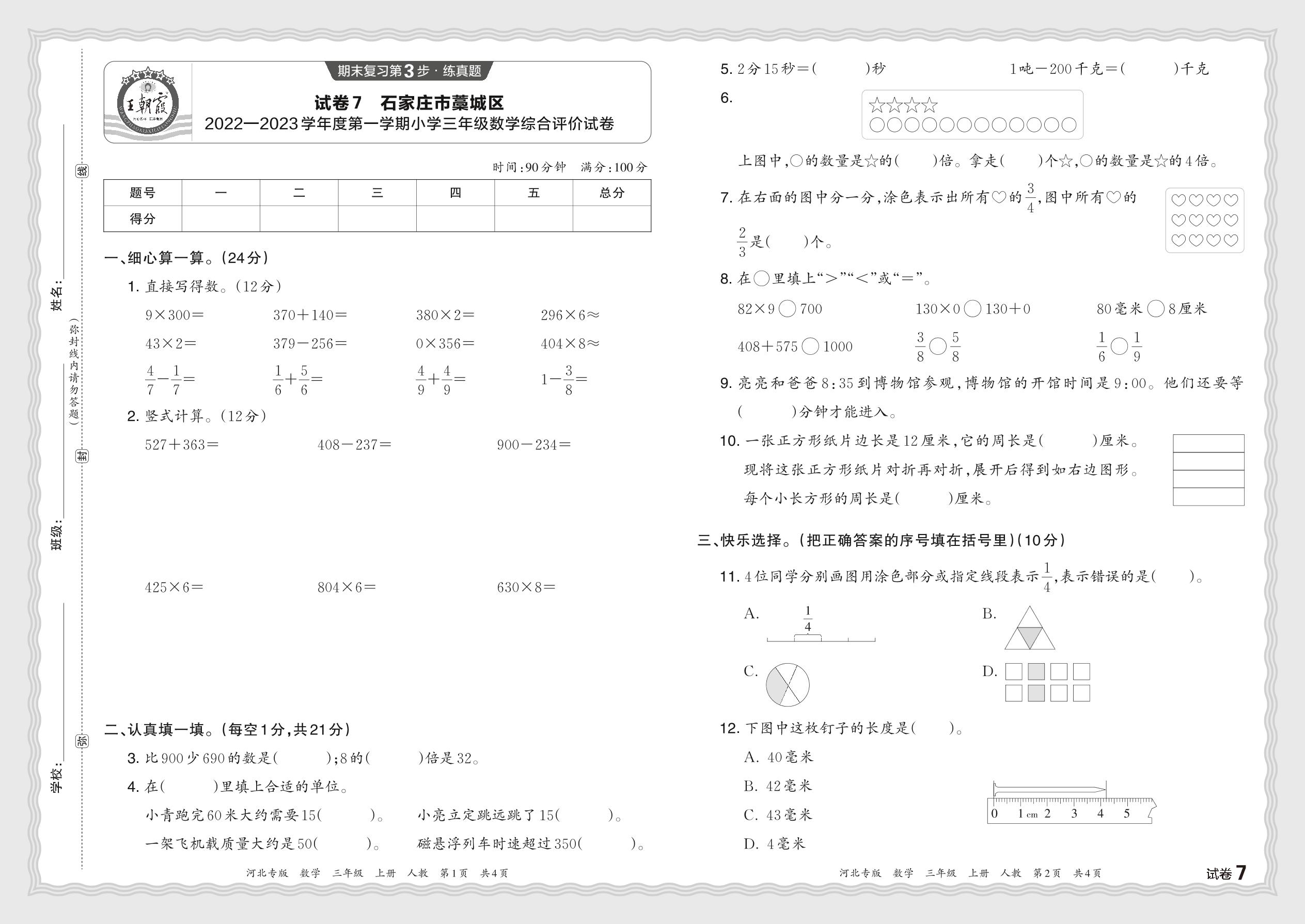 河北省石家庄市藁城区2022—2023学年度第一学期小学三年级数学综合评价试卷(人教版)【7】