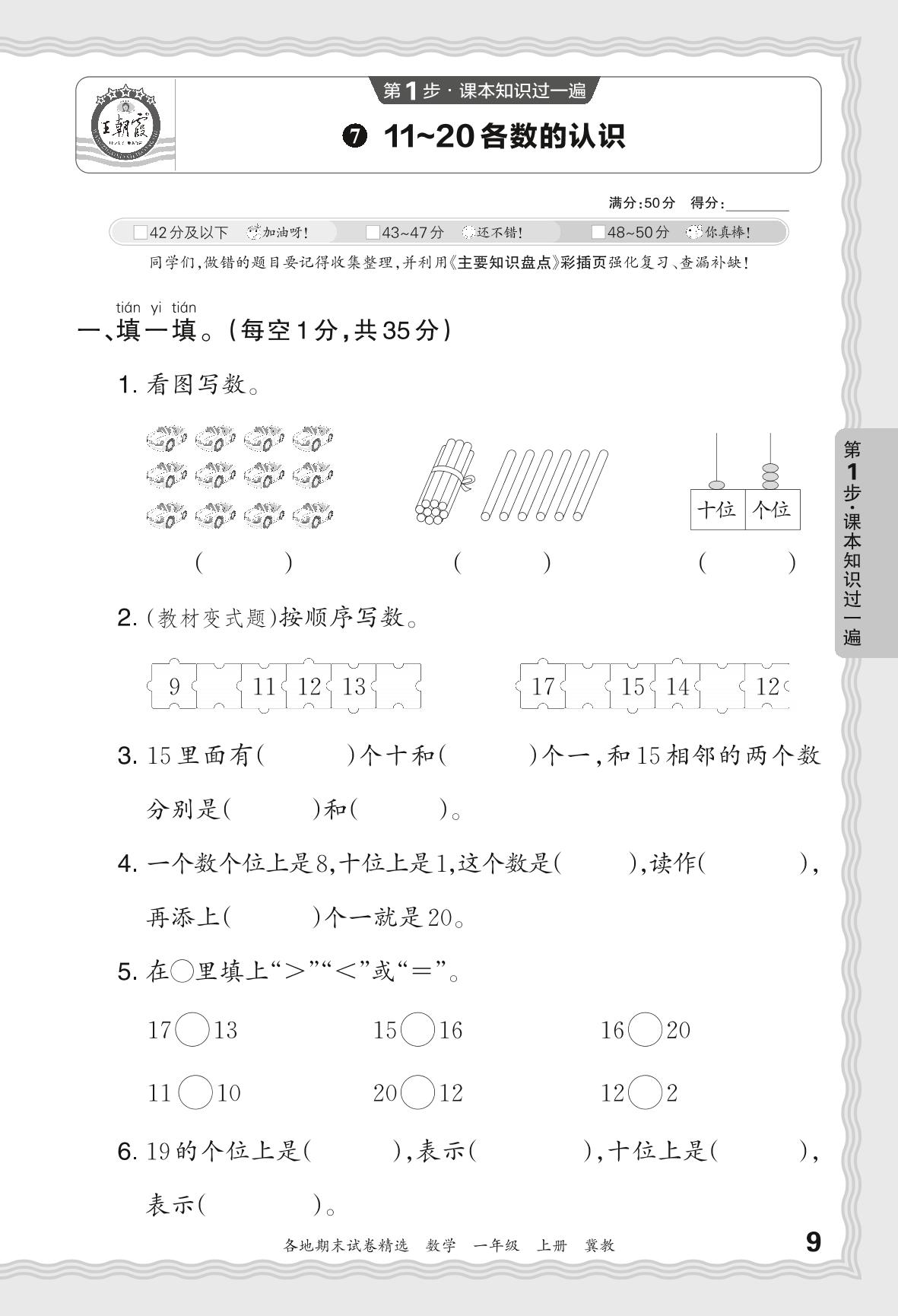 2023秋上册一年级数学冀教版 期末过课本JX版·11-20各数的认识【7】