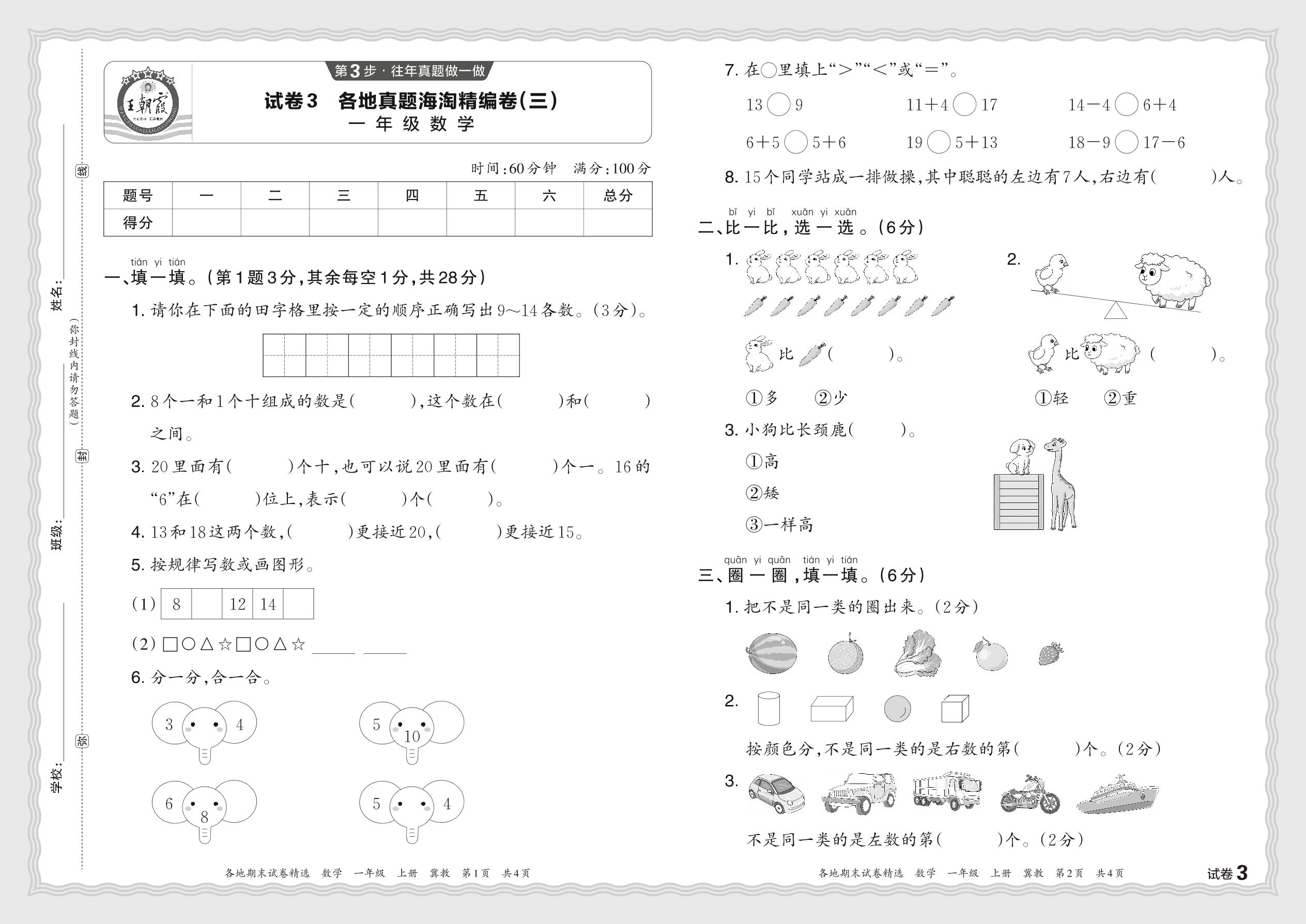 2023秋上册一年级数学冀教版 各地真题海淘精编卷(三)JX