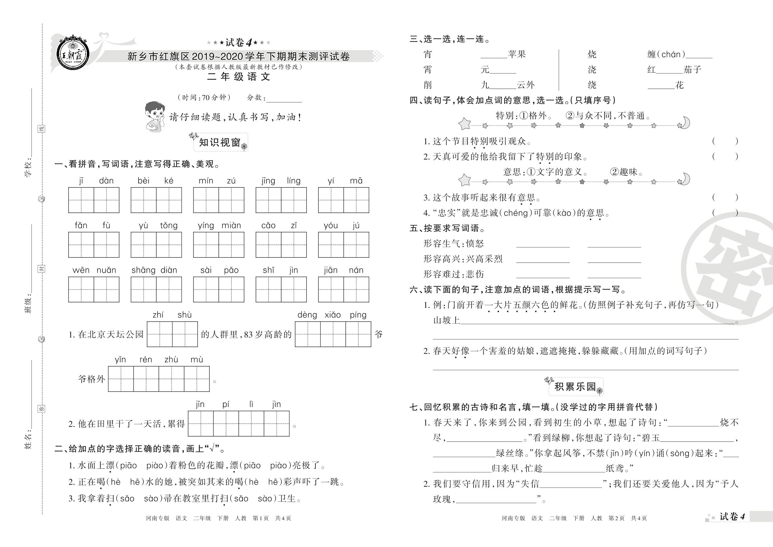 2019-2020学年第二学期新乡市红旗区二年级语文试卷(人教版)【4】