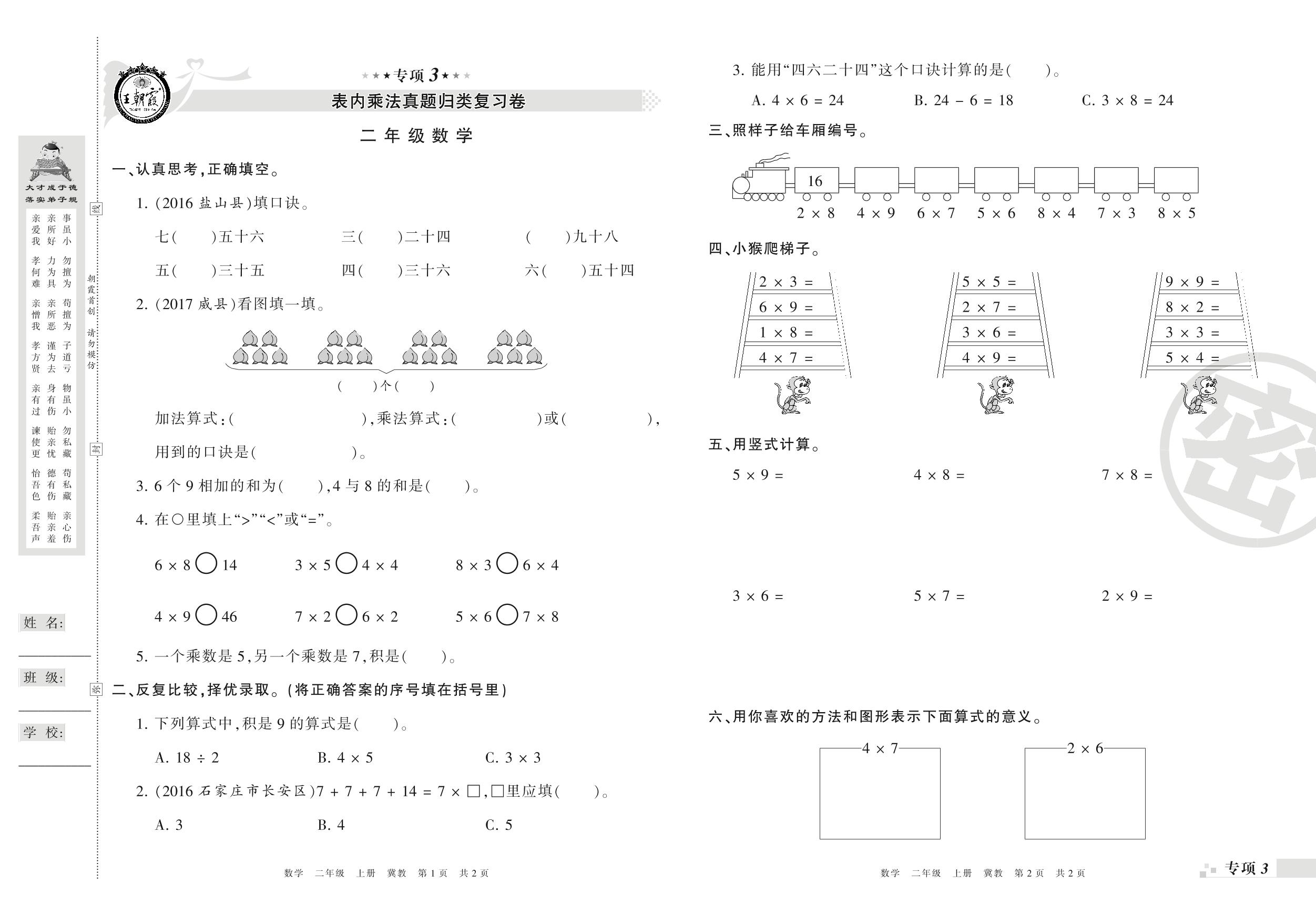 王朝霞期末专项卷——表内乘法、表内除法真题归类复习卷二年级上册数学(冀教版)_R210803104514【0】