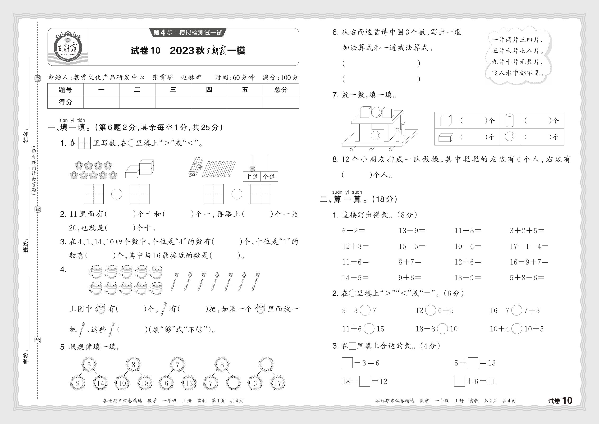 2023秋上册一年级数学冀教版 王朝霞一模JX