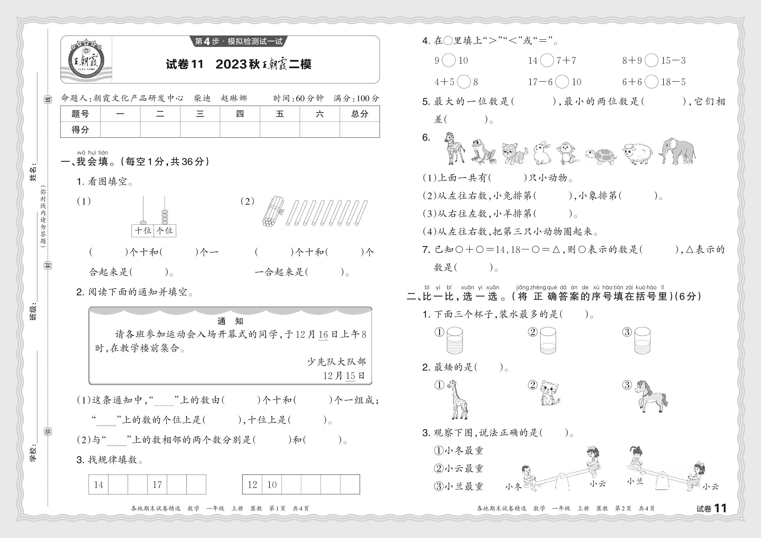 2023秋上册一年级数学冀教版 王朝霞二模JX