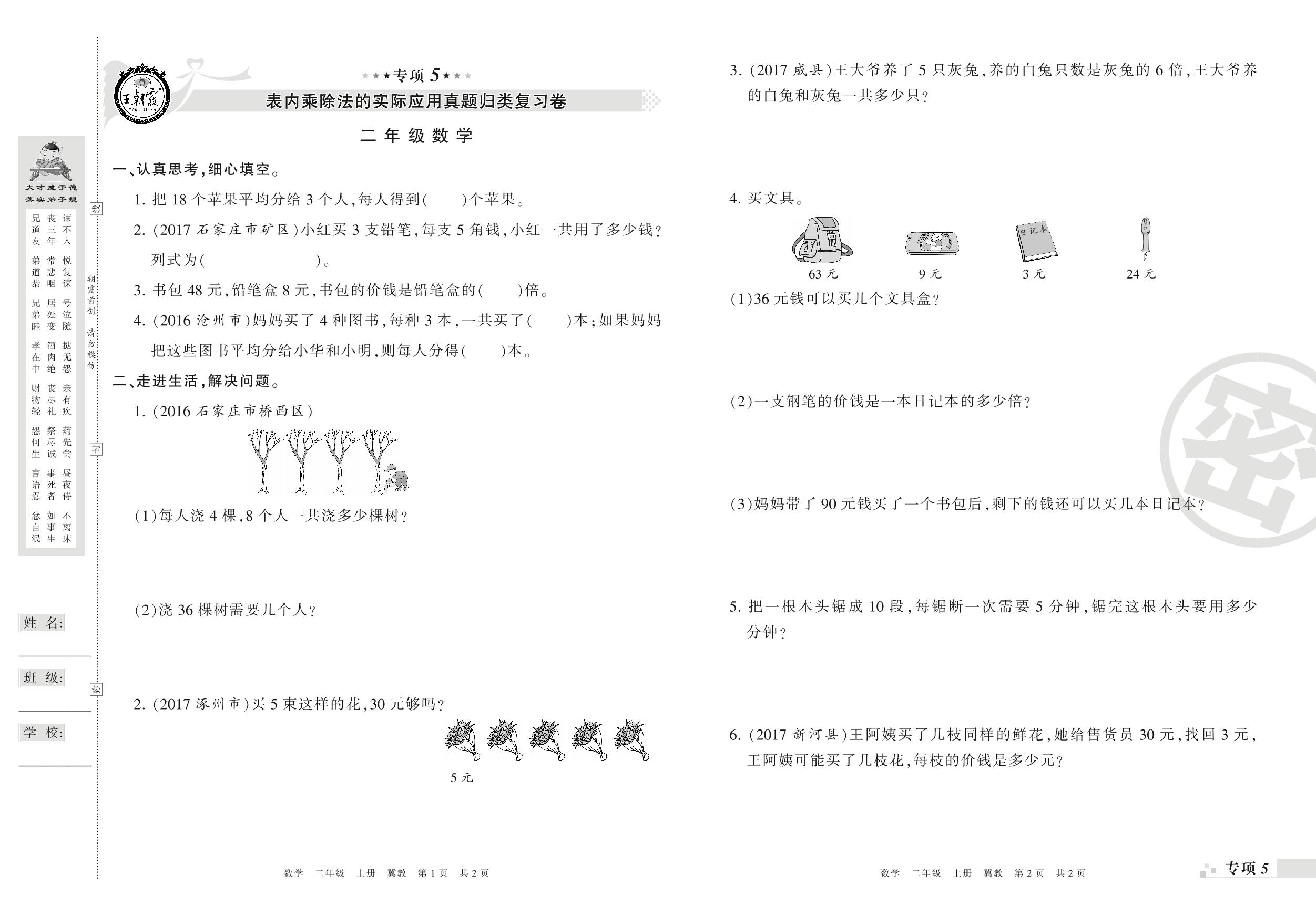 王朝霞期末专项卷——表内乘除法的实际应用、象形统计图和统计表及探索乐园真题归类复习卷二年级上册数学(冀教版)_R210803104519【0】