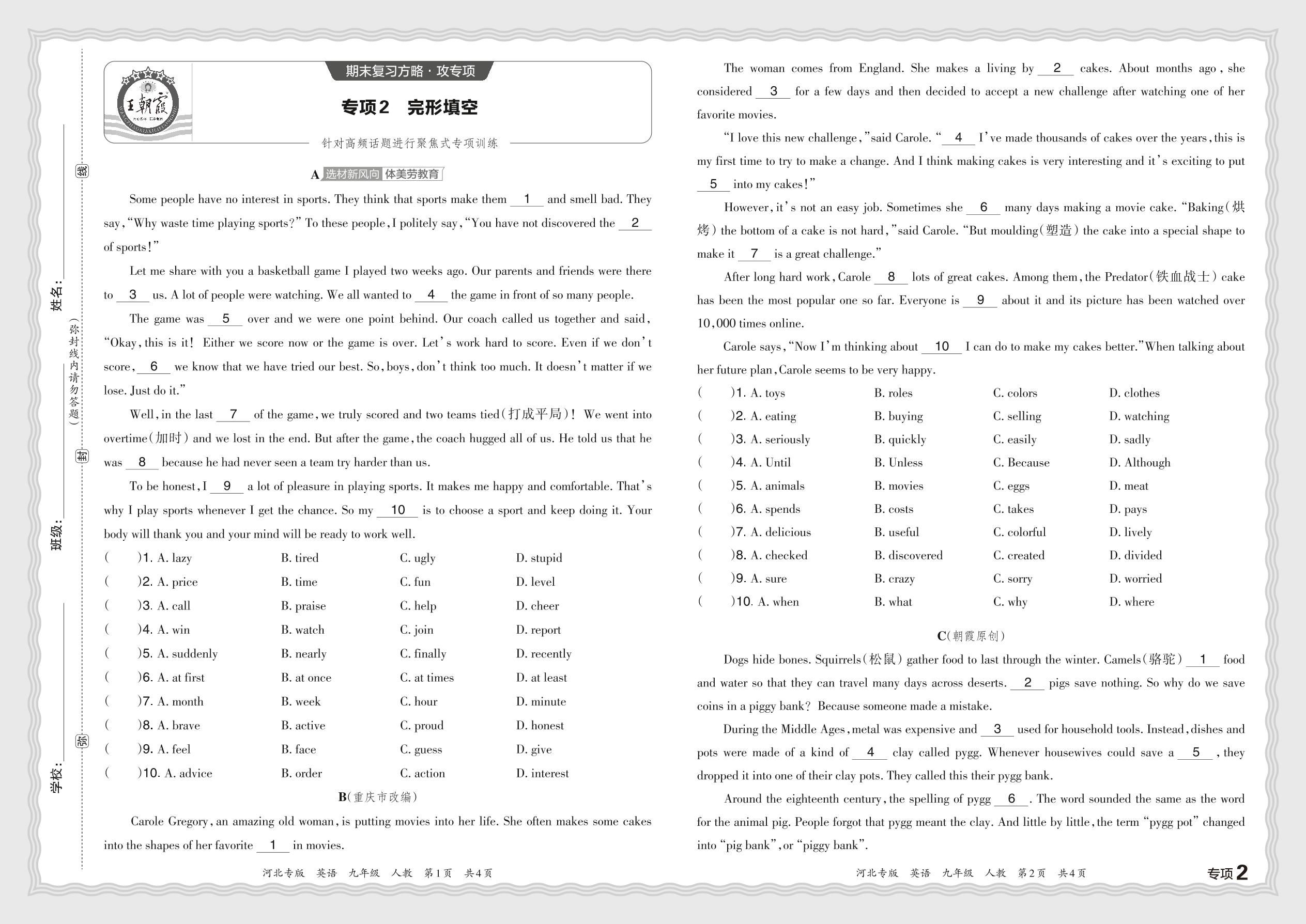 2023秋上册九年级英语人教版 期末专项卷·完形填空【2】