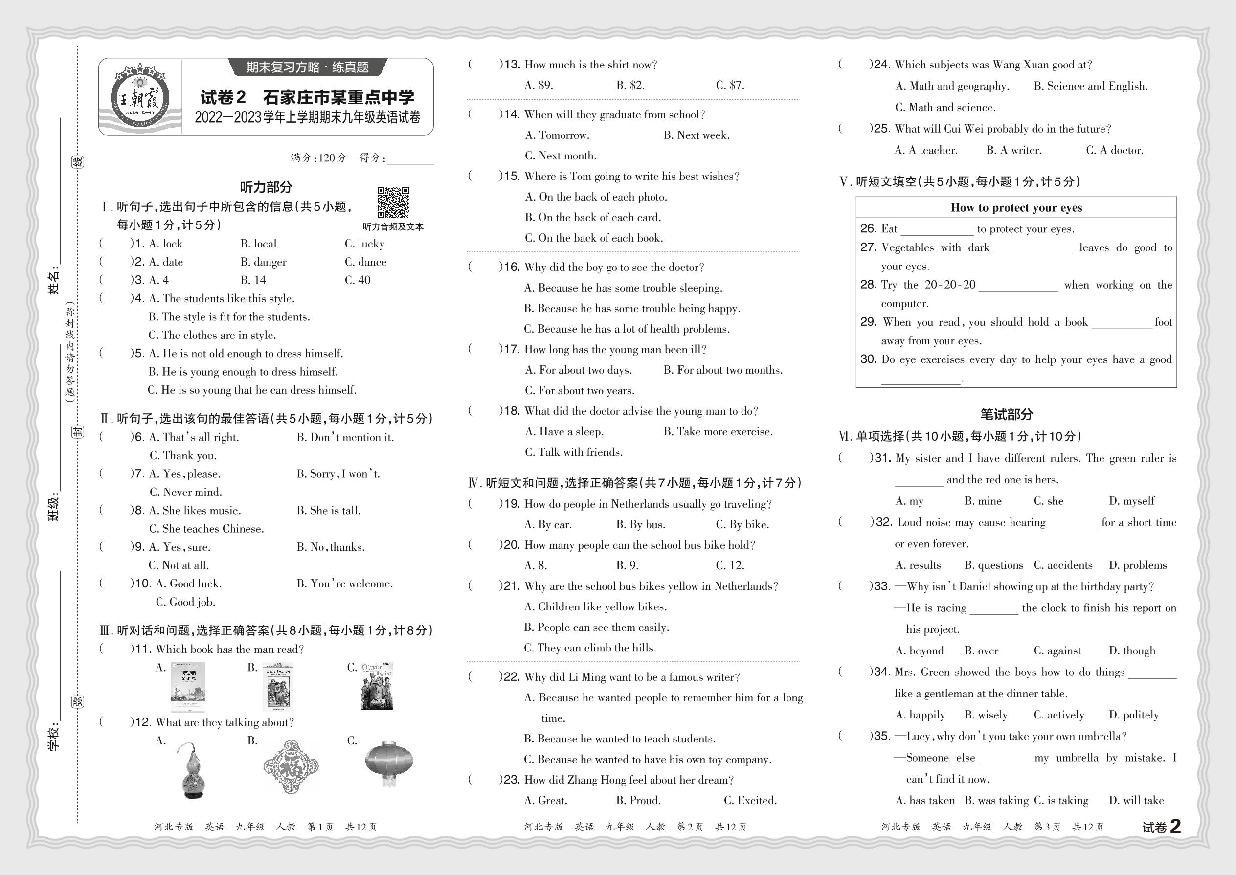 河北省石家庄市某重点中学2022—2023学年上学期期末九年级英语试卷(人教版)【2】