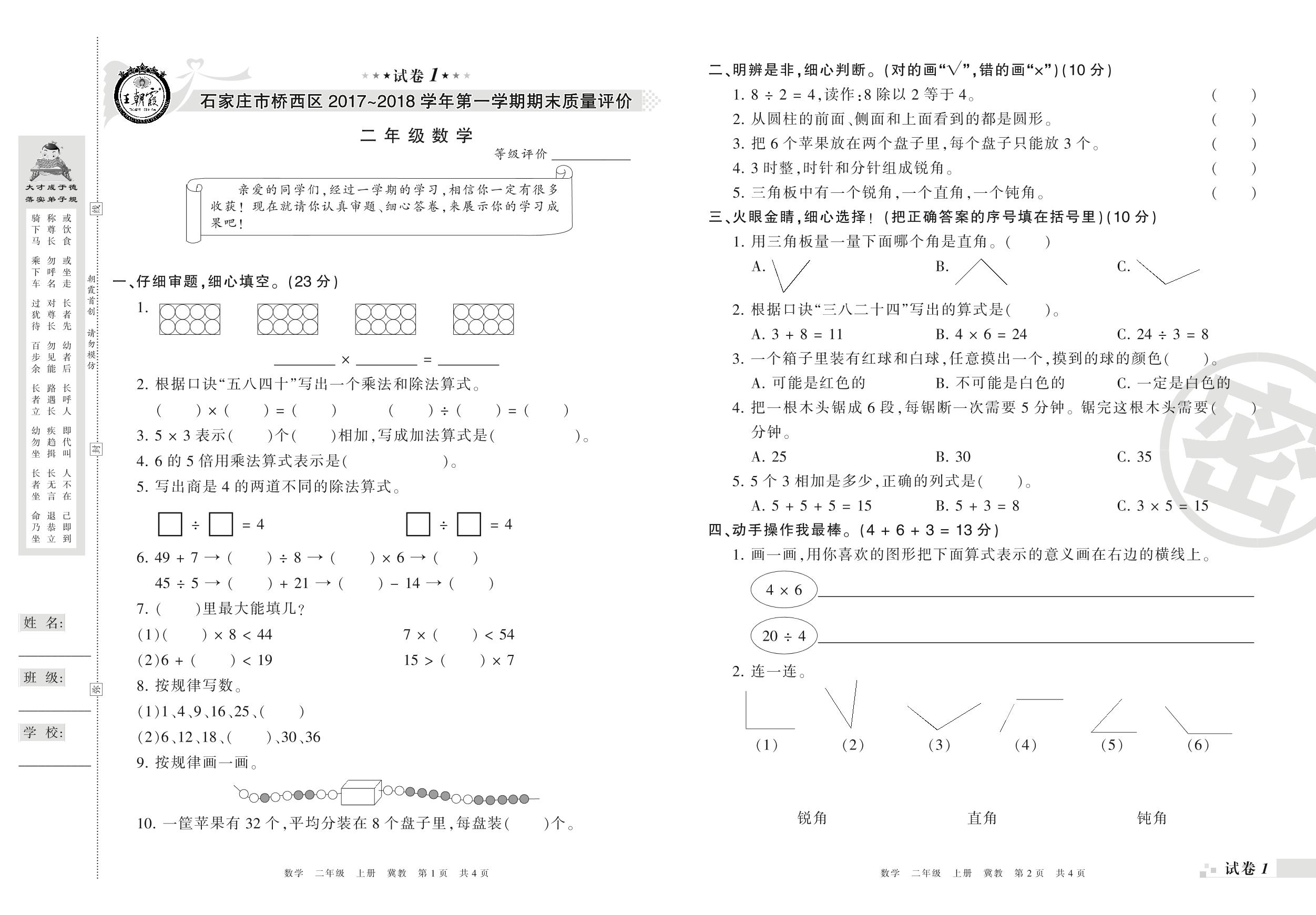 2017-2018学年第一学期石家庄市桥西区二年级数学试卷(冀教版)【1】