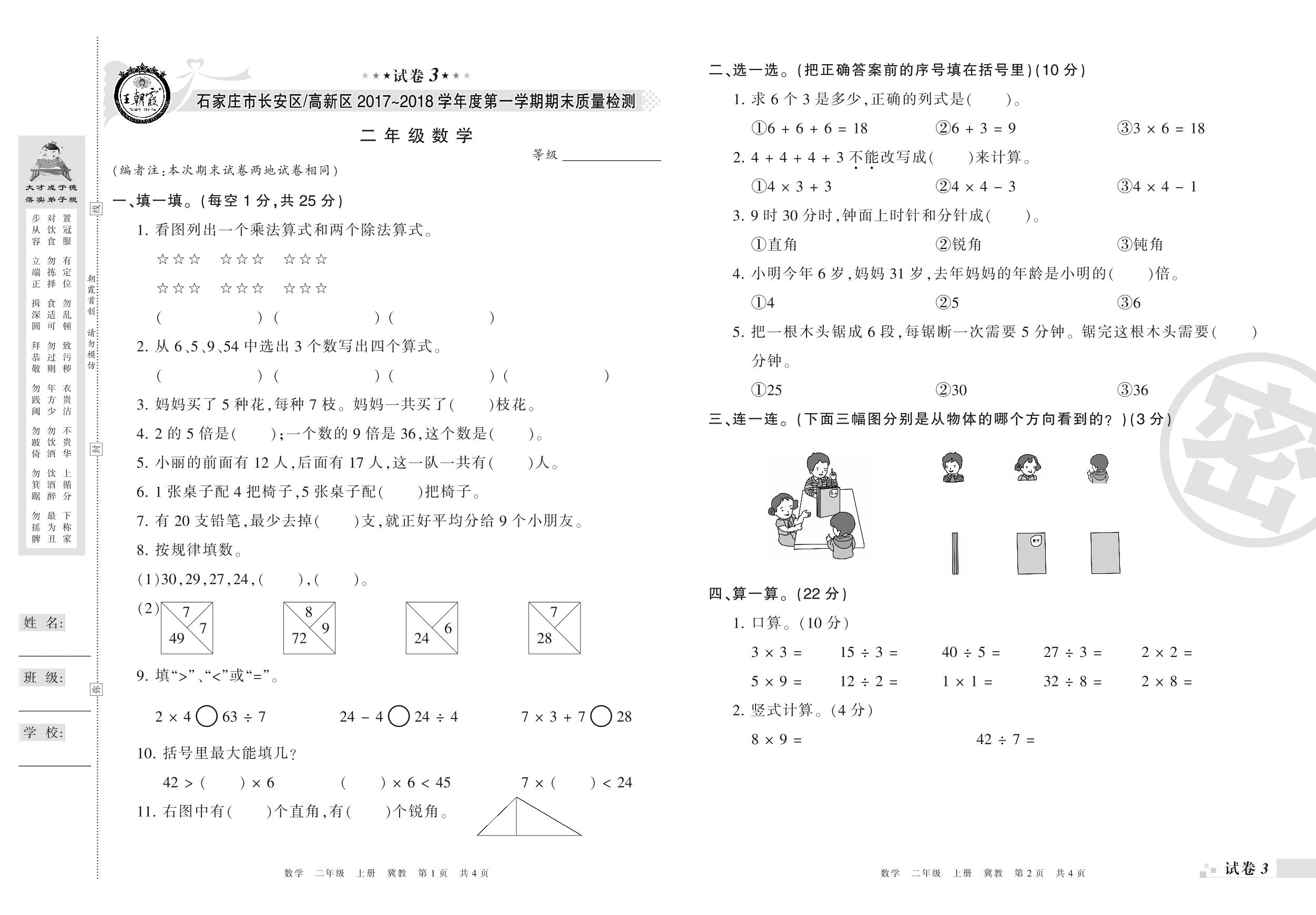2017-2018学年第一学期石家庄市长安区、高新区二年级数学试卷(冀教版)【3】