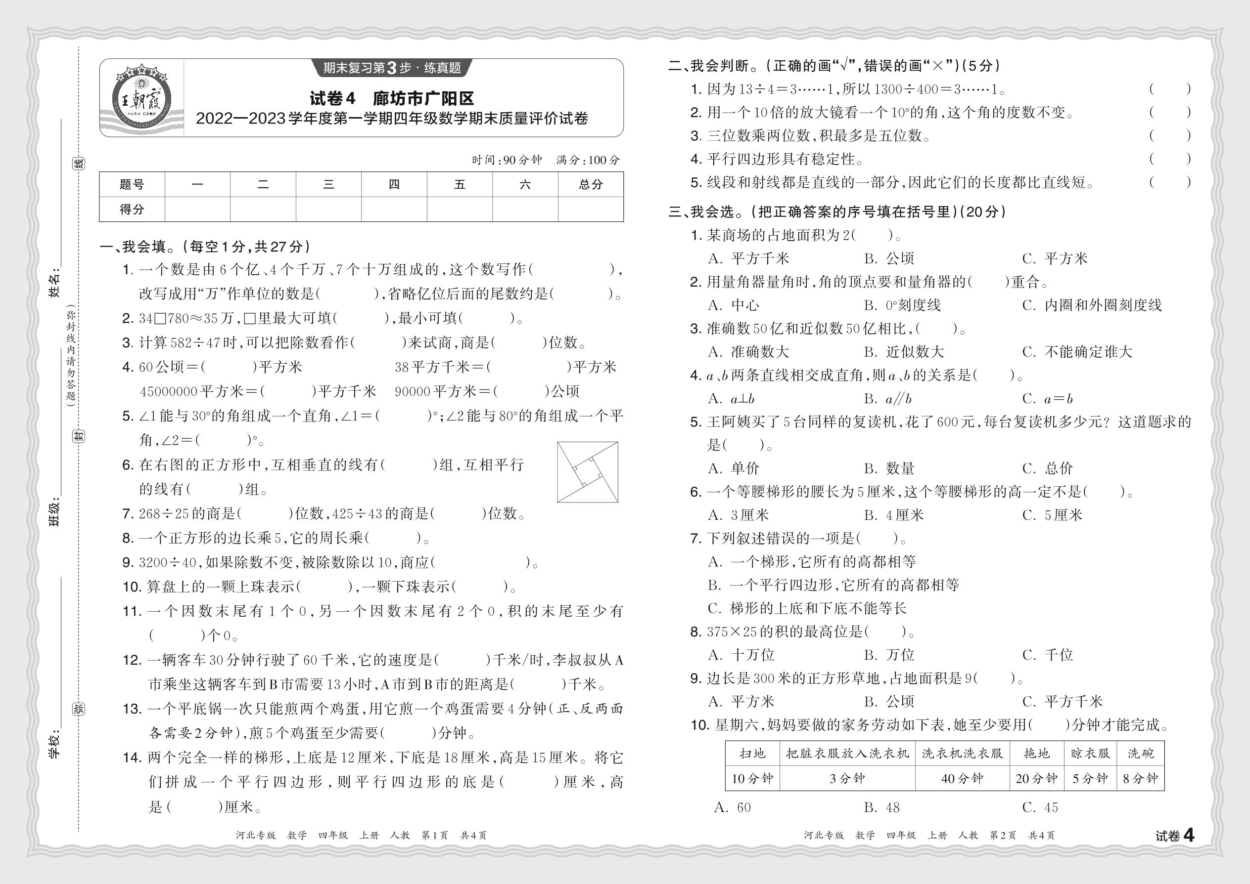河北省廊坊市广阳区2022—2023学年度第一学期四年级数学期末质量评价试卷(人教版)【4】