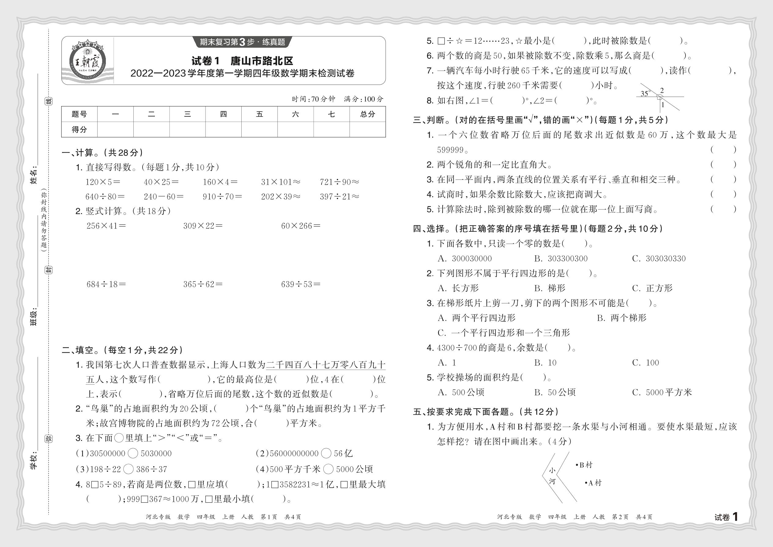 河北省唐山市路北区2022—2023学年度第一学期四年级数学期末检测试卷(人教版)【1】