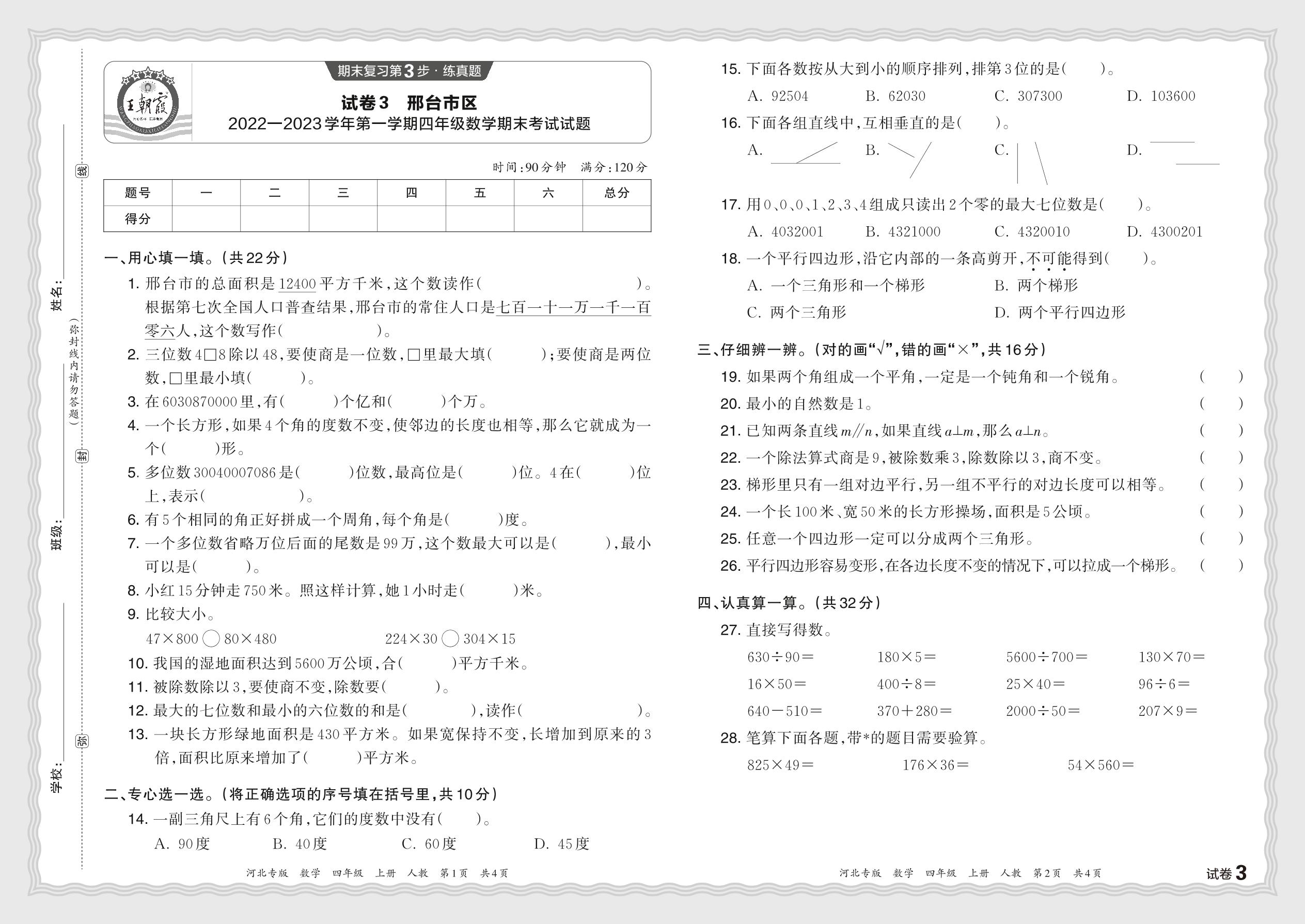 河北省邢台市区2022—2023学年第一学期四年级数学期末考试试题(人教版)【3】