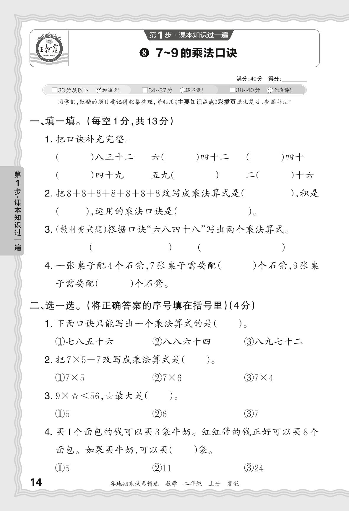 2023秋上册二年级数学冀教版 期末过课本JX版·7-9的乘法口诀【8】