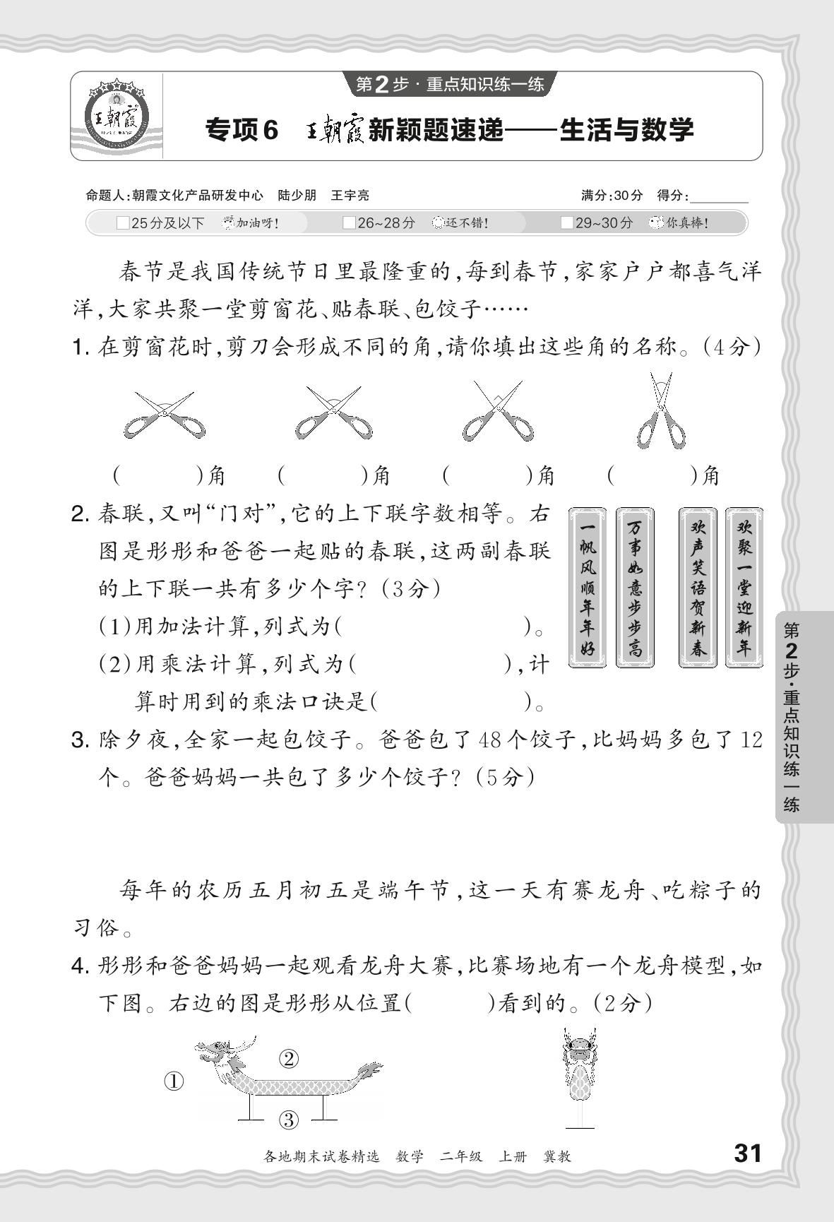 2023秋上册二年级数学冀教版 期末专项卷JX版·王朝霞新颖题速递——生活与数学【6】