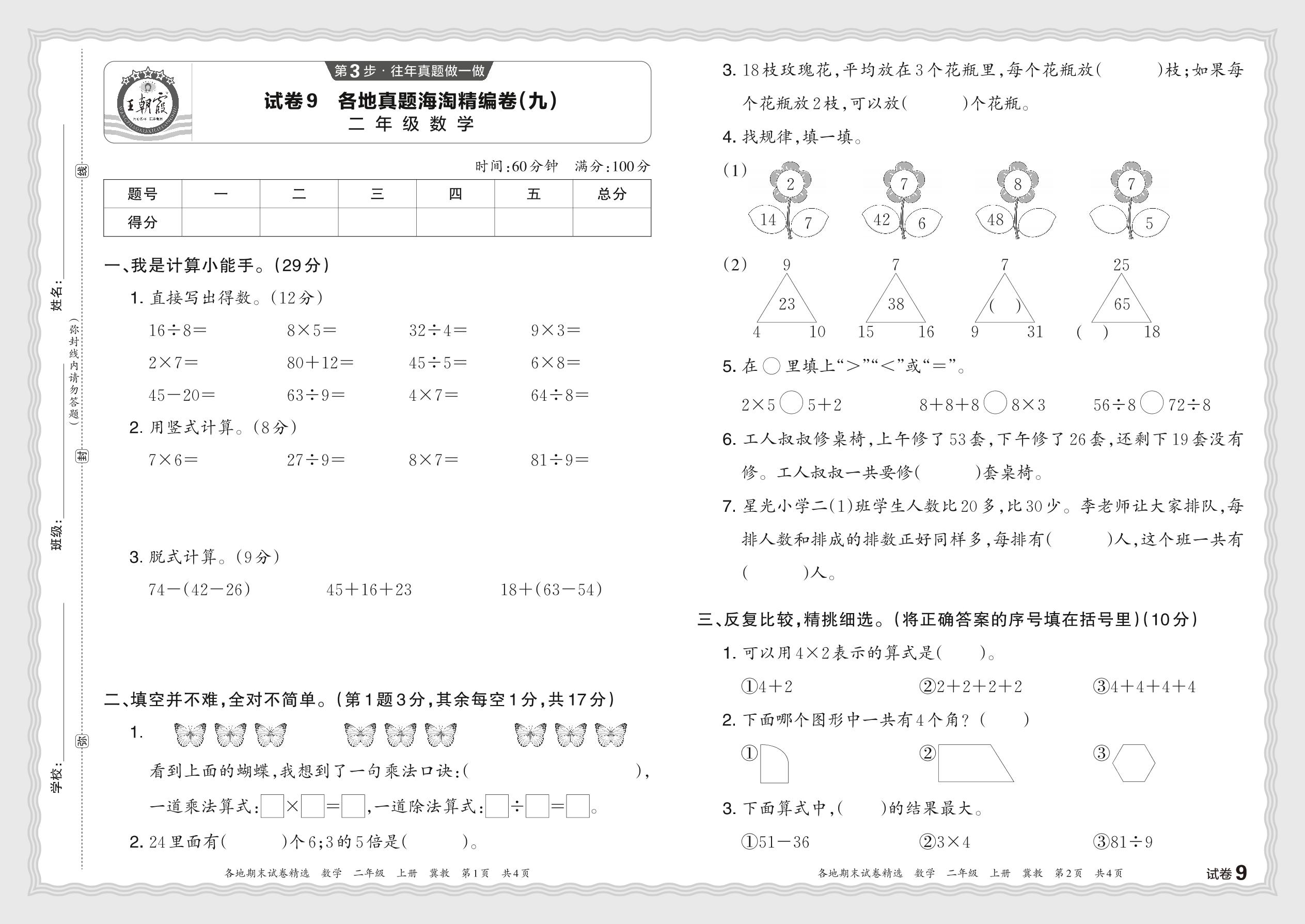 2023秋上册二年级数学冀教版 各地真题海淘精编卷(九)JX