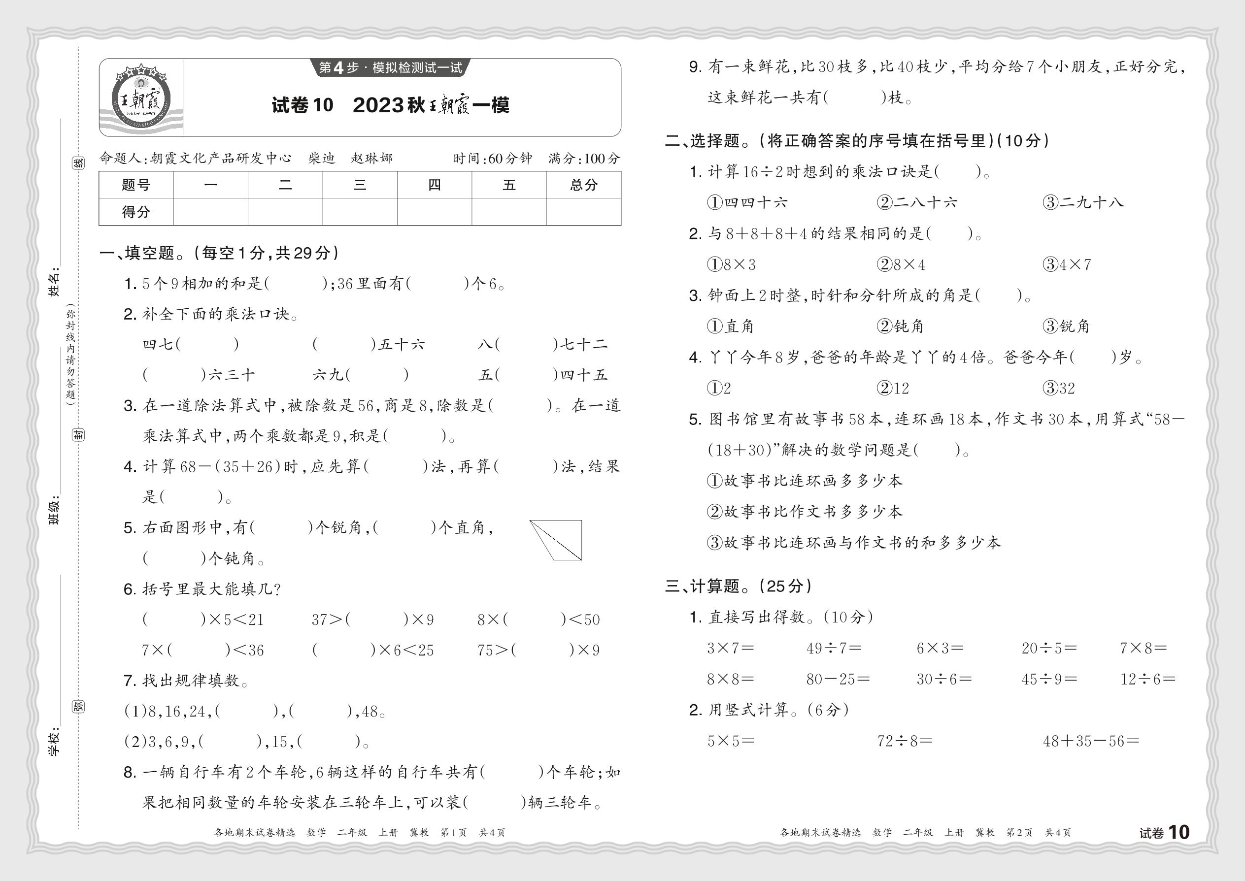 2023秋上册二年级数学冀教版 王朝霞一模JX