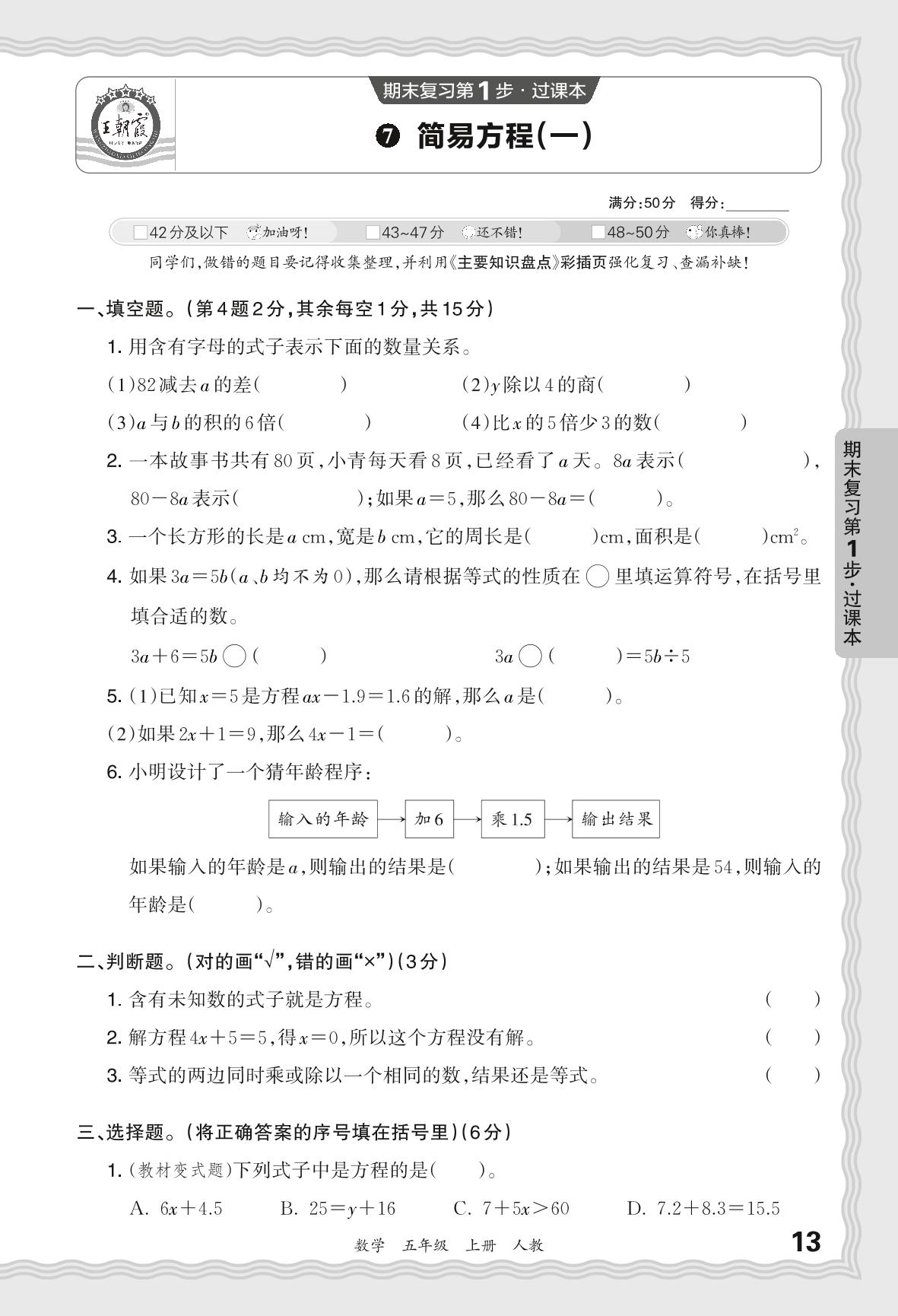 2023秋上册五年级数学人教版 期末过课本QMA版·简易方程(一)【7】