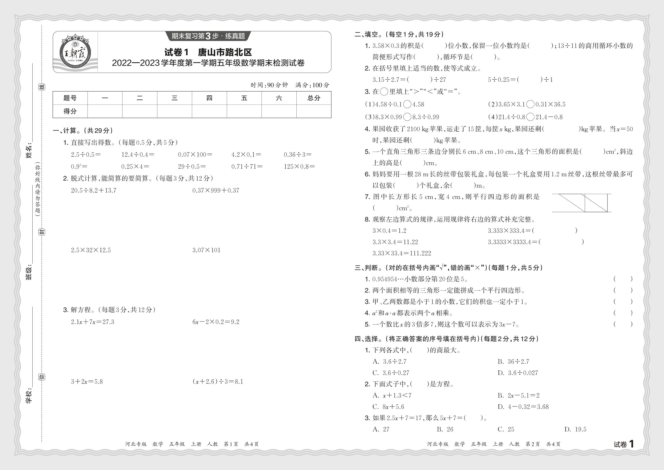 河北省唐山市路北区2022—2023学年度第一学期五年级数学期末检测试卷(人教版)【1】