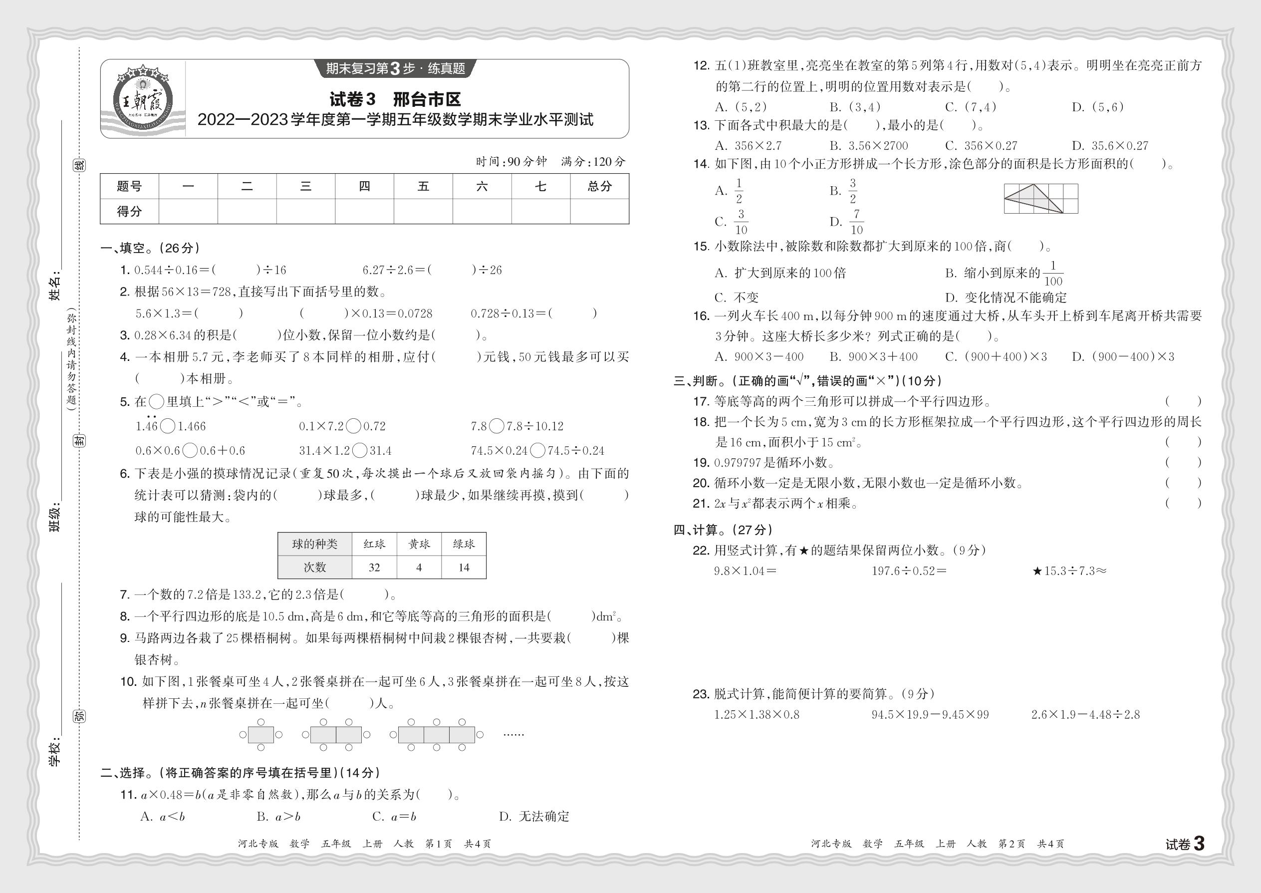 河北省邢台市区2022—2023学年度第一学期五年级数学期末学业水平测试(人教版)【3】