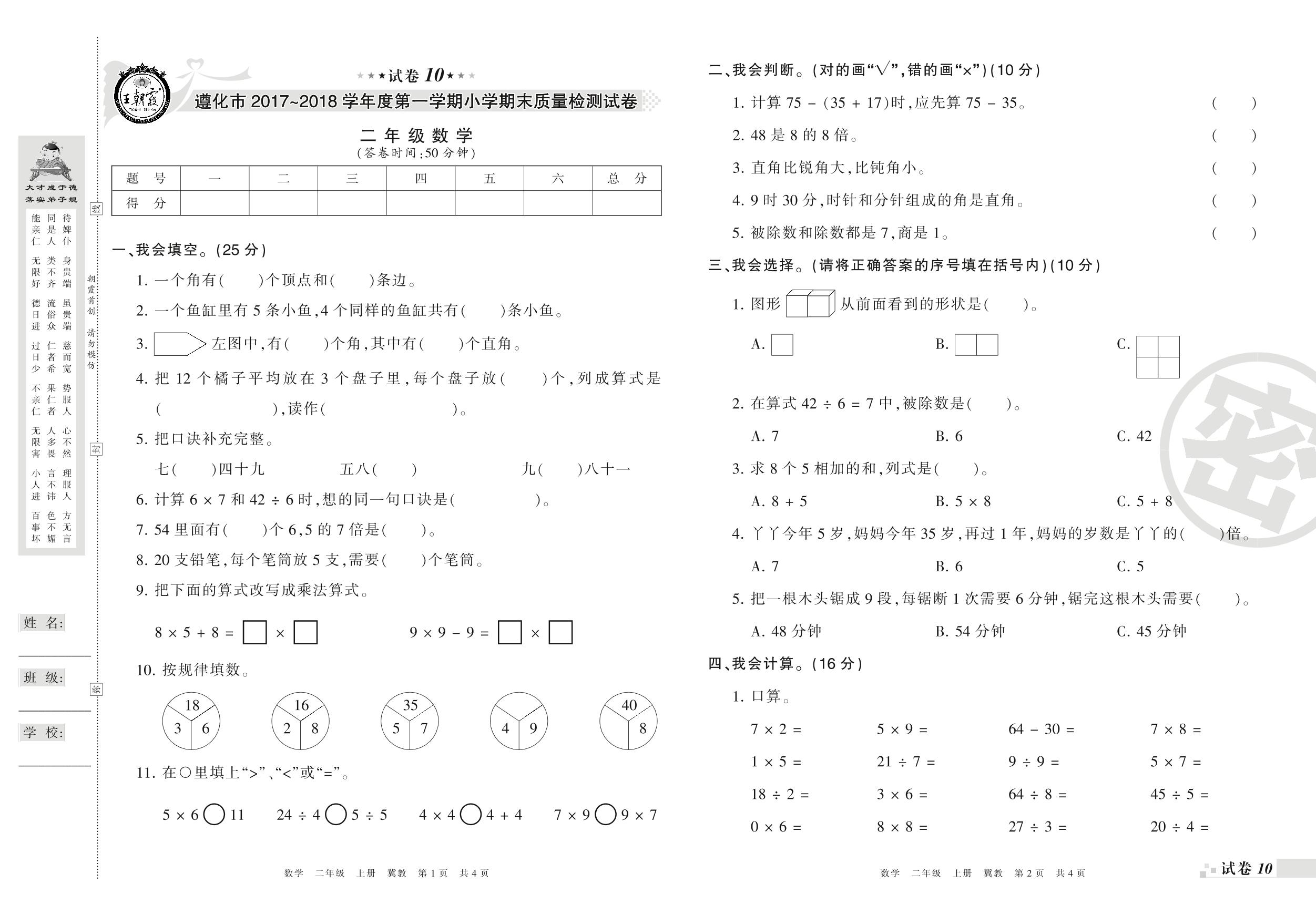 2017-2018学年第一学期遵化市二年级数学试卷(冀教版)【10】